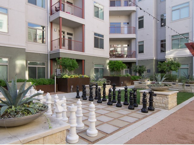Game courtyard with community grills, bocce ball court, and life size chess board