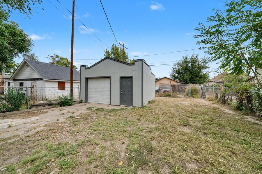 The exterior features a beautiful covered porch, HUGE fenced yard, and 2 car detached garage for storage and convenience!