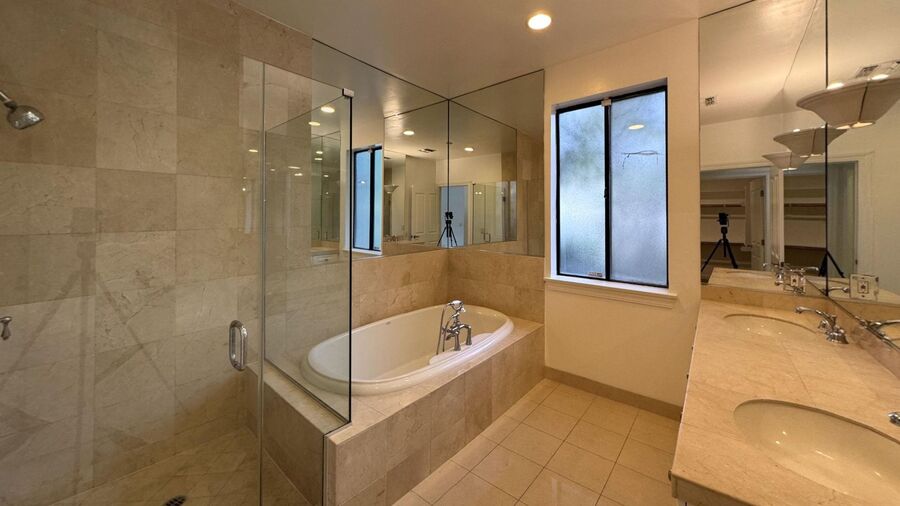 Welcome to this stunning 2-bedroom, 2-bath condo in the highly sought-after Pacific Palisades, where comfort meets effortless coastal sophistication. A formal entry welcomes you into an expansive living space featuring soaring ceilings, a focal fireplace, and seamless access to a private balcony, perfect for relaxing or entertaining. The open-concept kitchen is beautifully appointed with top-of-the-line appliances, sleek countertops, and generous cabinetry, creating a space that is both functional and elegant. Enjoy year-round comfort with central air and heat. Down the hallway, you’ll find ample closet space, a full bathroom with a shower, and a convenient side-by-side washer and dryer. The secondary bedroom is spacious and bright, complete with high ceilings and mirrored closet doors. The primary suite is a true retreat, offering extra space, a private balcony, a walk-in closet, and a luxurious en-suite bathroom featuring a double vanity, soaking tub, and separate shower. Additional highlights include two dedicated parking spaces, a secure coded entry system for peace of mind, and abundant storage throughout. Experience refined living in one of Los Angeles’ most desirable neighborhoods.