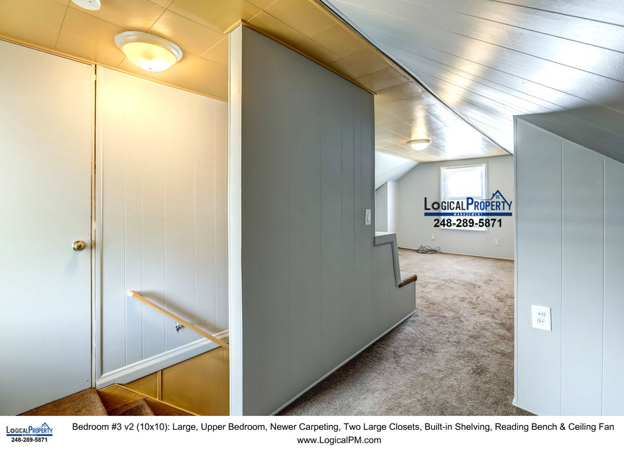 On the main floor, youll find two comfortable bedrooms, each featuring beautiful hardwood floors, ceiling fans, and spacious closets. Upstairs, a large private bedroom retreat awaits, complete with plush newer carpeting, two oversized closets, built-in shelving, a cozy reading bench, and its own ceiling fan, perfect for unwinding at the end of the day.