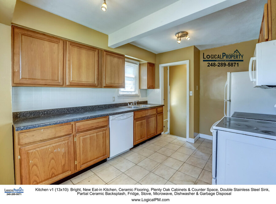 The heart of the home is the bright, fully updated eat-in kitchen, designed to inspire. It showcases elegant ceramic flooring, abundant oak cabinetry, generous counter space, and a sleek double stainless-steel sink. Fully equipped with refrigerator, stove, microwave, dishwasher, and garbage disposal, this kitchen truly has it all.