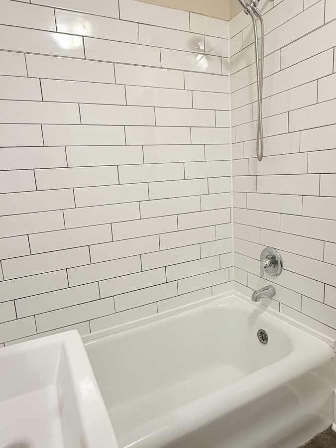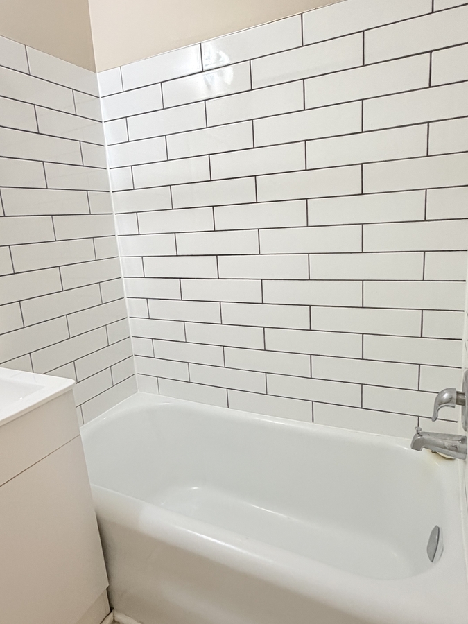 Renovated bathroom with new tub, vanity, toilet, and subway tile