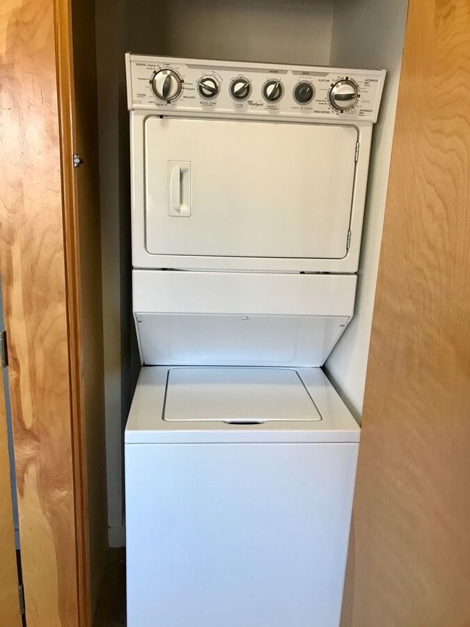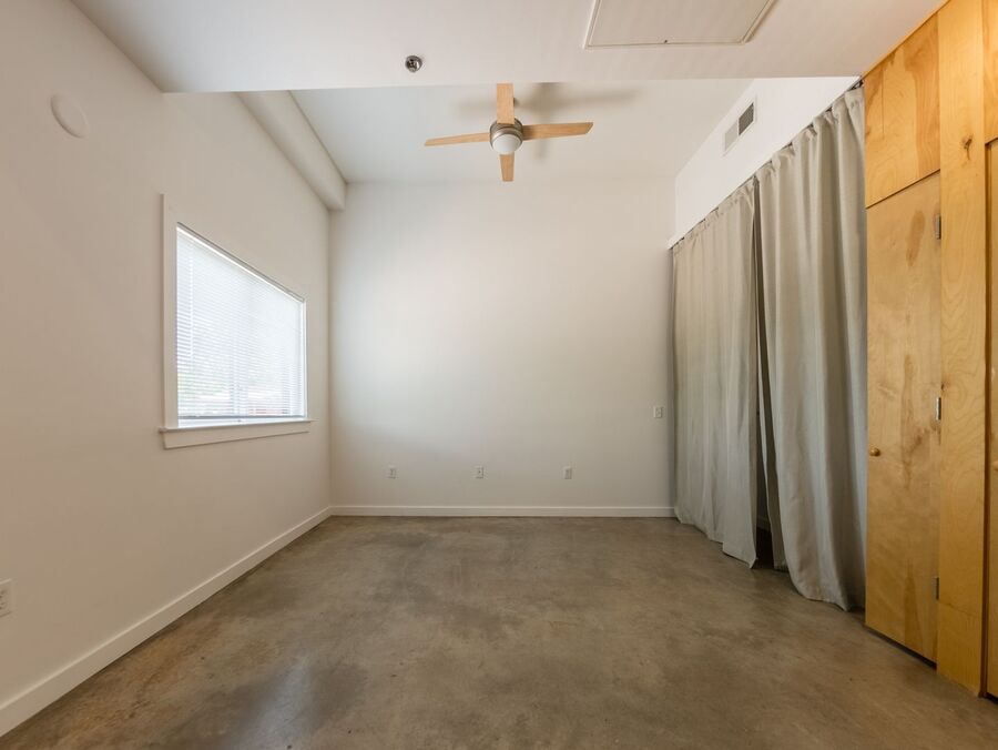 Step inside to soaring ceilings, polished concrete floors, and floor-to-ceiling windows that flood the living space with natural light. The open kitchen features premium quartz countertops, stainless steel appliances, modern cabinetry, and a large breakfast bar. The bedroom includes a custom built-in closet and remote-controlled ceiling fan, while the bathroom features a large walk-in shower and dual flush toilet. A washer/dryer is included for your convenience.