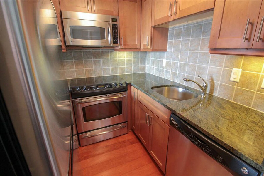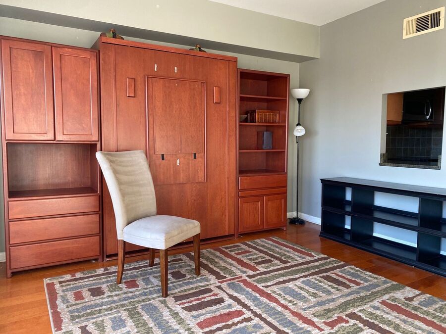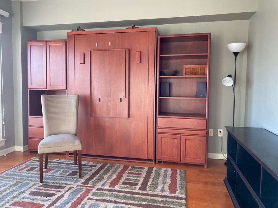 This well-designed space features floor-to-ceiling windows that flood the unit with natural light and showcase panoramic views of the Mississippi River and skyline. A Murphy bed easily folds away to create more room for living and entertaining. The modern kitchen includes stainless steel appliances, sleek wooden cabinetry, and granite countertops. Multiple closets and shelving provide excellent storage. Washer and dryer included!