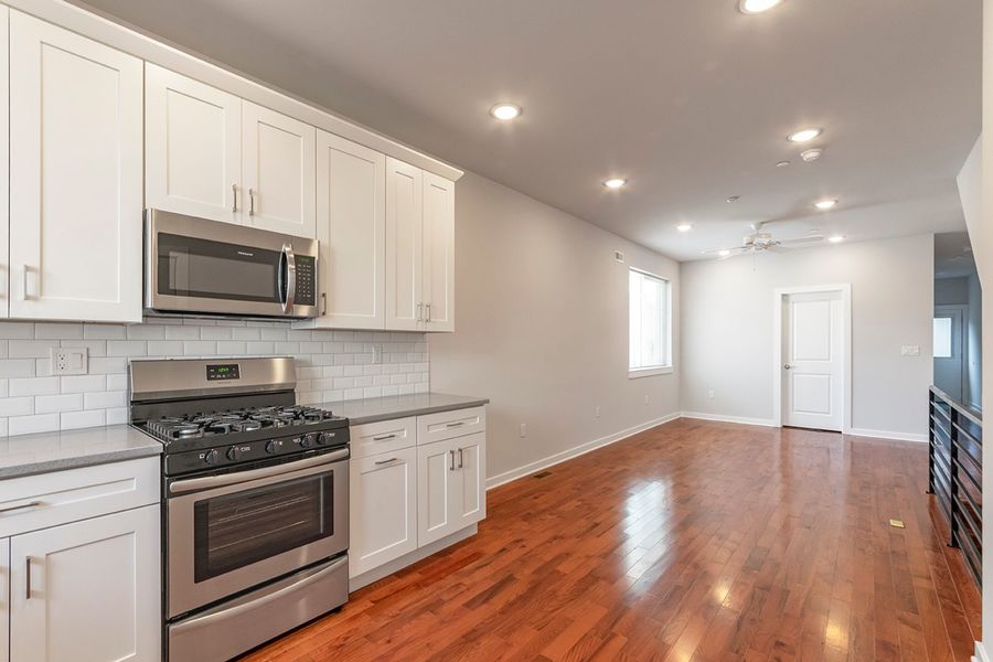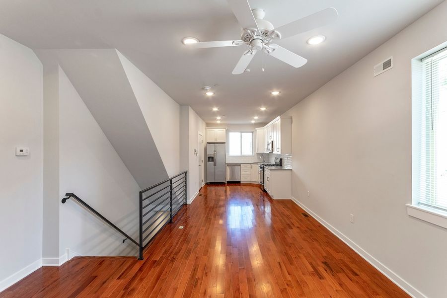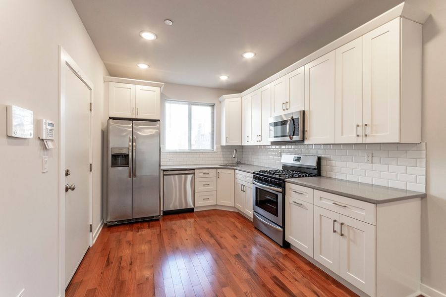 Fabulous 2 bedroom, 2 bathroom bi-level apartment in a sunny corner duplex building. The apartment has everything: recessed lighting, central air, ceiling fans, laundry room, video intercom, alarm system, and oak hardwood floors. The first floor has a spacious open concept living room, dining room and designer kitchen with quartz countertops, subway tile backsplash, stainless steel appliances, and access to a large patio. Continue towards the back of the apartment and you will find a large bedroom, full bathroom, and hall linen closet. In the basement you will find the second bedroom with a full bathroom and separate den. Convenient location just a few blocks from public transportation, coffee shops and restaurants.