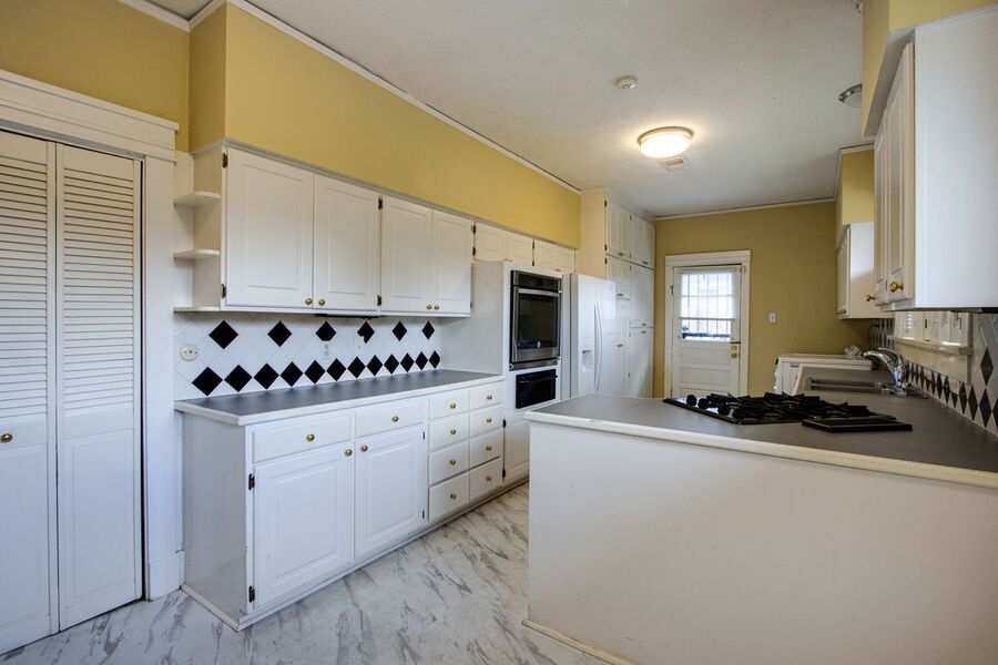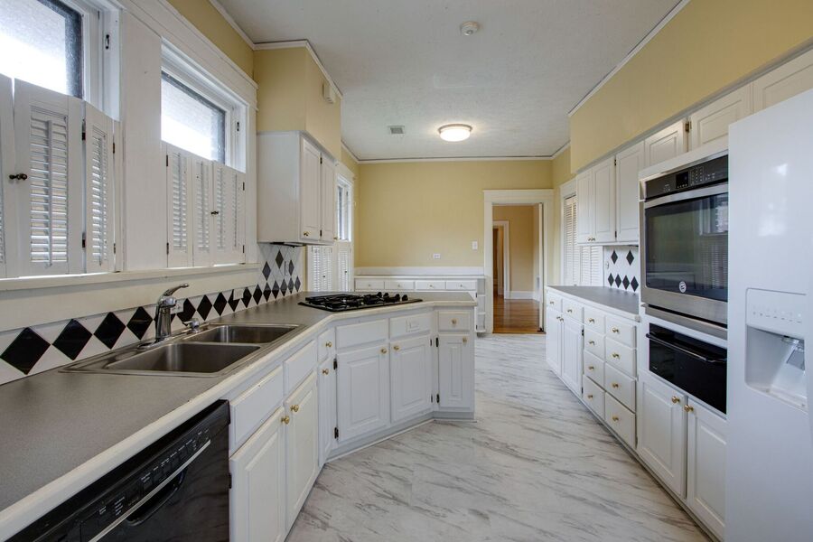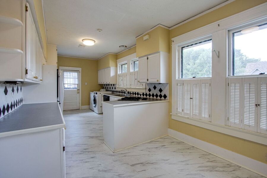 Inside, you’ll find original hardwood flooring, large windows that bring in natural light, and gorgeous built-ins throughout. The living room features a gas fireplace and opens to the sunroom, while the formal dining room flows into an oversized eat-in kitchen with tons of cabinetry—ideal for cooking or entertaining.