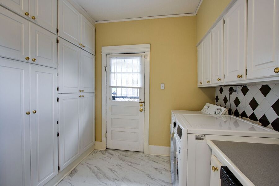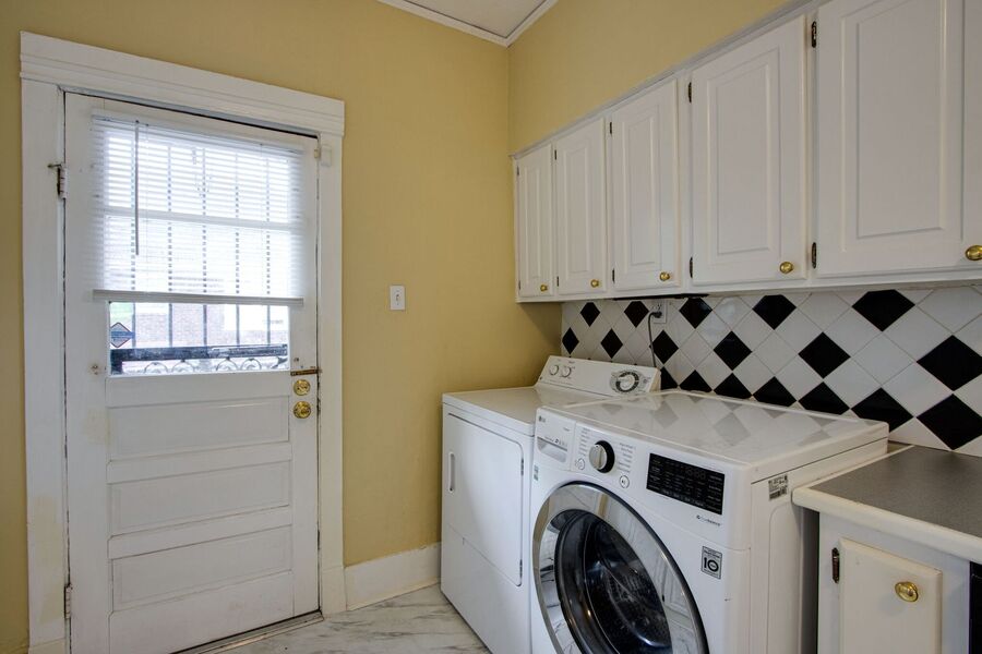The laundry room includes a full-sized washer and dryer, additional cabinet storage, and access to a small back deck. All bedrooms offer spacious closets and bright windows, and the primary bedroom includes an en suite bathroom with shower.