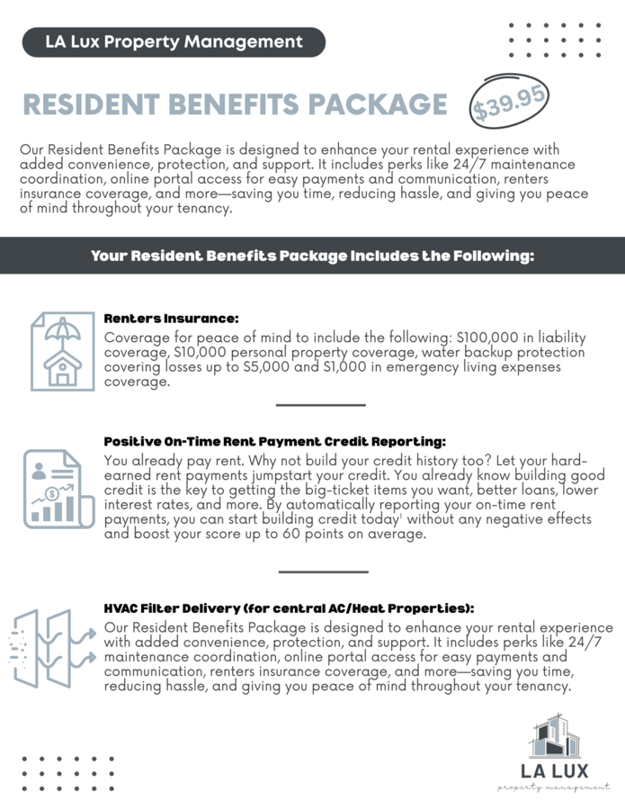All LA Lux Property Management residents are enrolled in the Resident Benefits Package (RBP) for $39.95/month which includes liability insurance, credit building, HVAC filter replacement and access to the LA Lux Tech Stack.