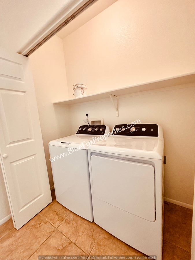 A laundry closet with a washer and dryer is included. The master bedroom features its own private bathroom with a double-sink vanity, tub-and-shower combo, separate toilet room, and a walk-in closet.