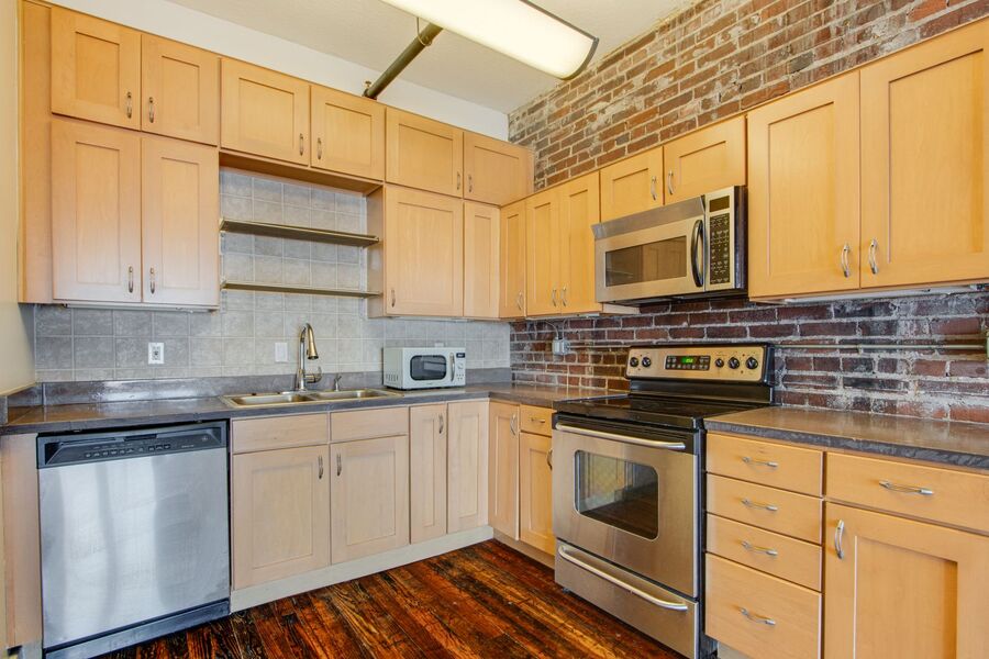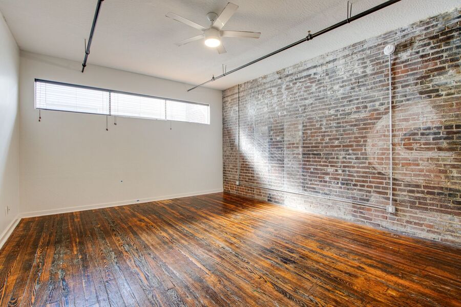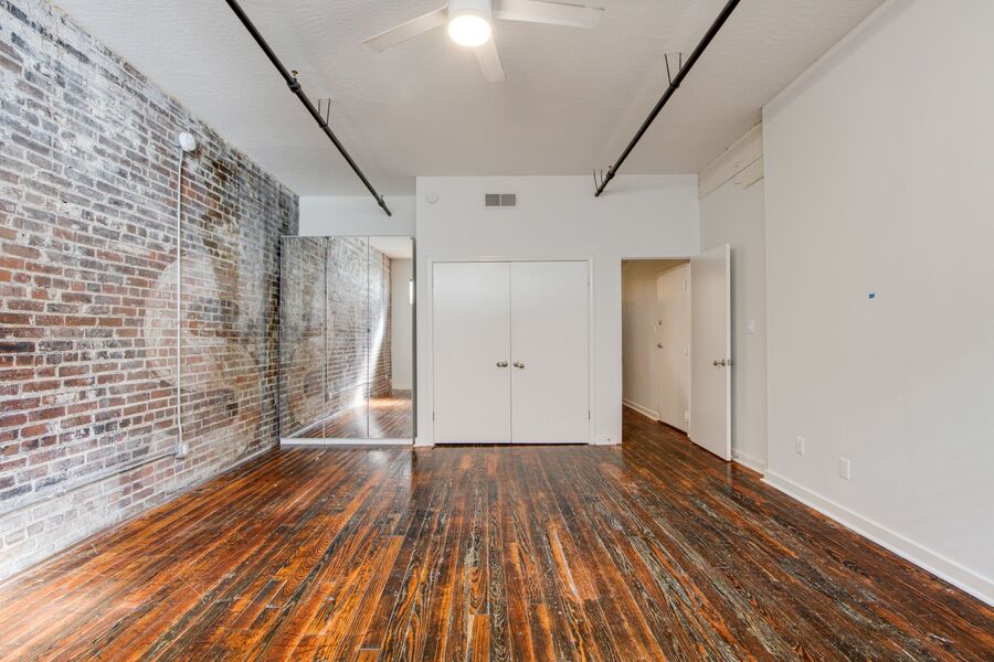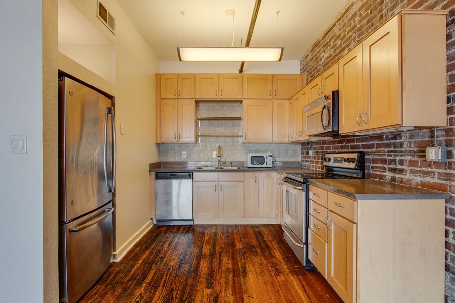 Spacious 1 bed/1 bath condo at The William Farrington on South Main Street downtown! This magnificent space has high ceilings, beautiful original hardwood flooring throughout, and exposed brick walls with original painted lettering. The living area is long (37'x15') with room for both a living and dining area. Floor to ceiling windows provide a great overlook of all the action of South Main and downtown. The kitchen includes all stainless steel appliances. The large (22'x15') bedroom is located at the back of the condo for more privacy and features a full wall of closets, completely with shelving and drawers.