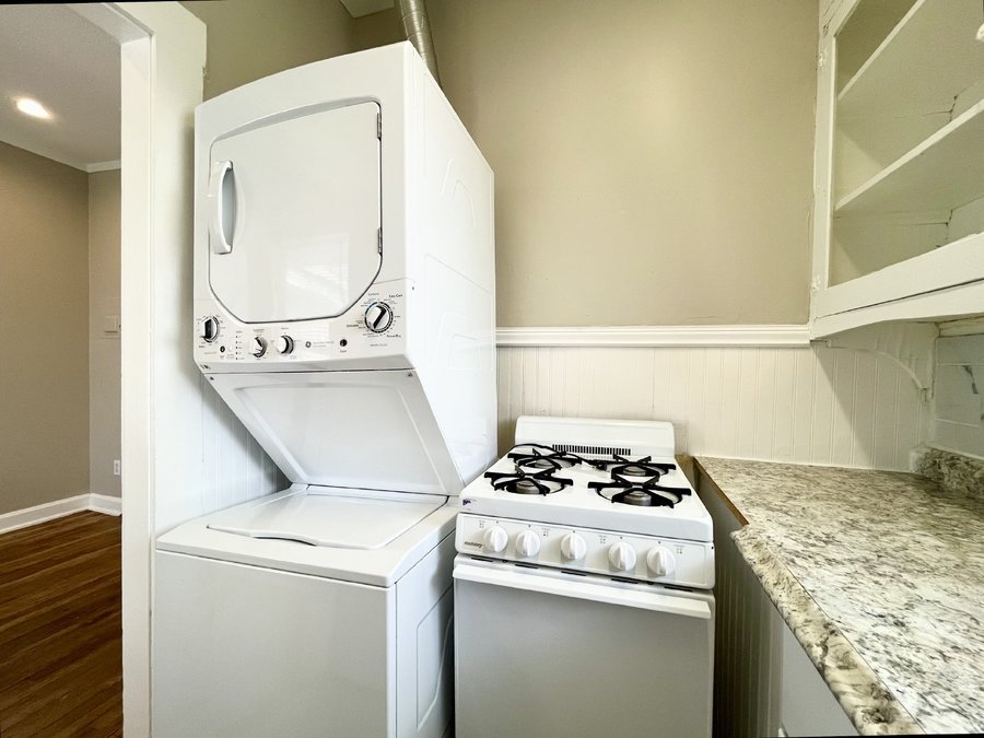 The well-appointed kitchen features a stove/range and refrigerator, providing essential appliances for daily living. Additionally, the unit comes equipped with a stacked washer/dryer unit, adding convenience to your lifestyle.