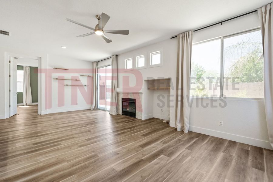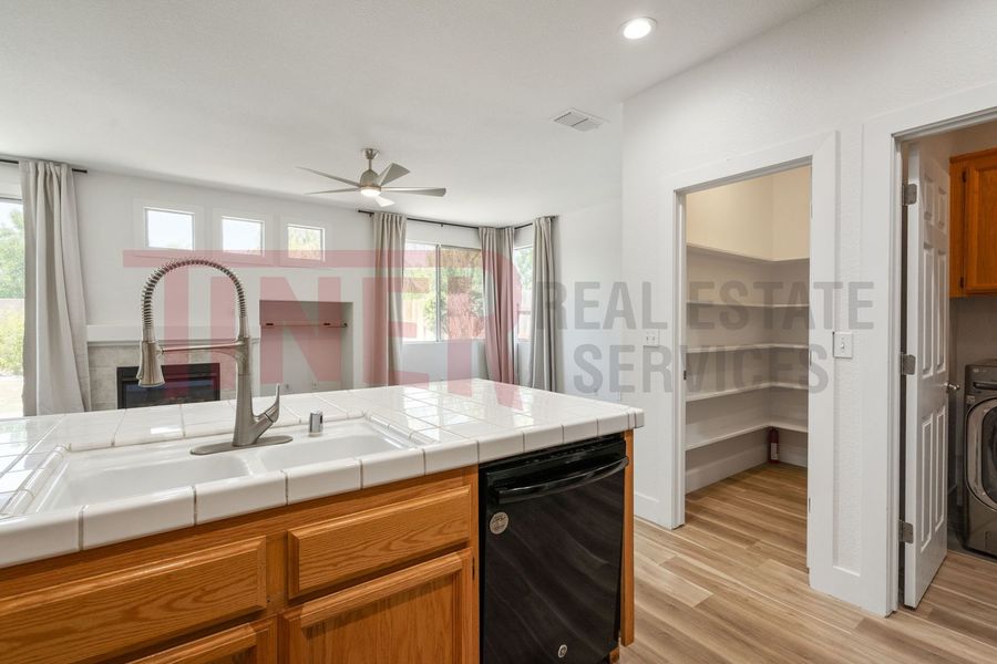 Beautiful 3 bedroom, 2 bathroom, 2 car garage home. This cozy home features a light living room with built-in media niche, a dining area, and patio access. Open kitchen with stainless steel appliances, tile countertops, dining bar, and pantry. Inside laundry room with washer and dryer. Spacious primary bedroom and ensuite bath with soaking tub, dual sinks, and large closet.