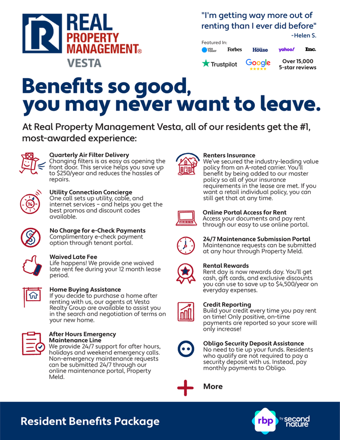 All RPM Vesta residents are enrolled in the Resident Benefits Package (RBP) for $34.95/month which includes renters insurance, our best-in-class resident rewards program, HVAC air filter delivery (for applicable properties), credit building to help boost your credit score with timely rent payments, move-in concierge service making utility connection and home service setup a breeze during your move-in, security deposit alternative with Obligo and much more! More details upon application.