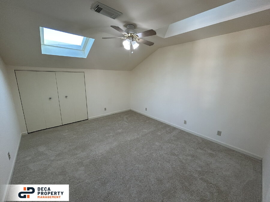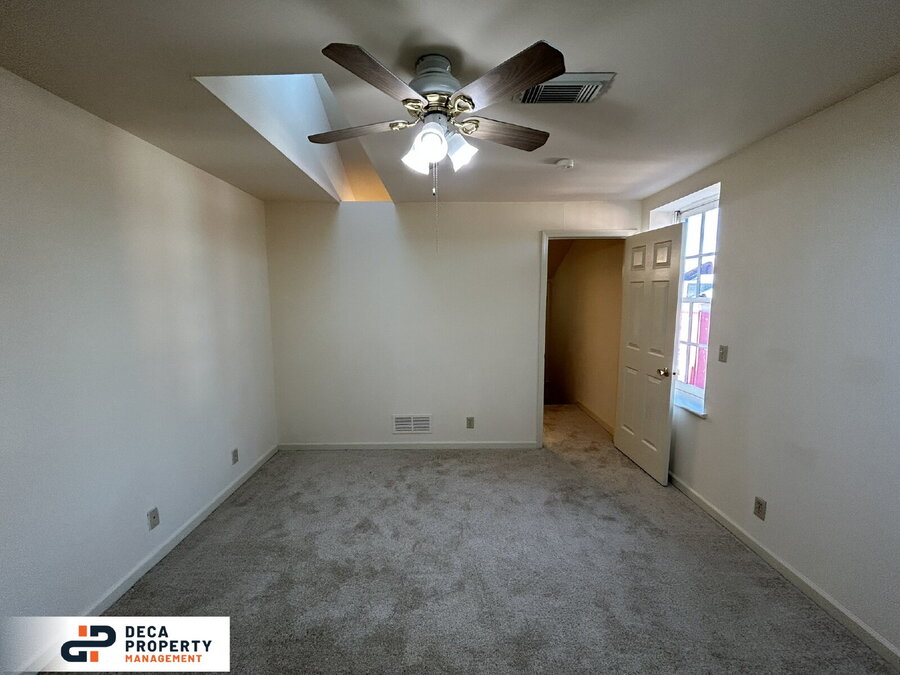 The first bedroom is located just behind the kitchen and includes closet space along with fantastic street views. Upstairs, you’ll find the main bedroom complete with plush carpeting, closet space, a ceiling fan, and stunning skylight windows that allow natural sunlight to pour in, creating a warm and inviting retreat.