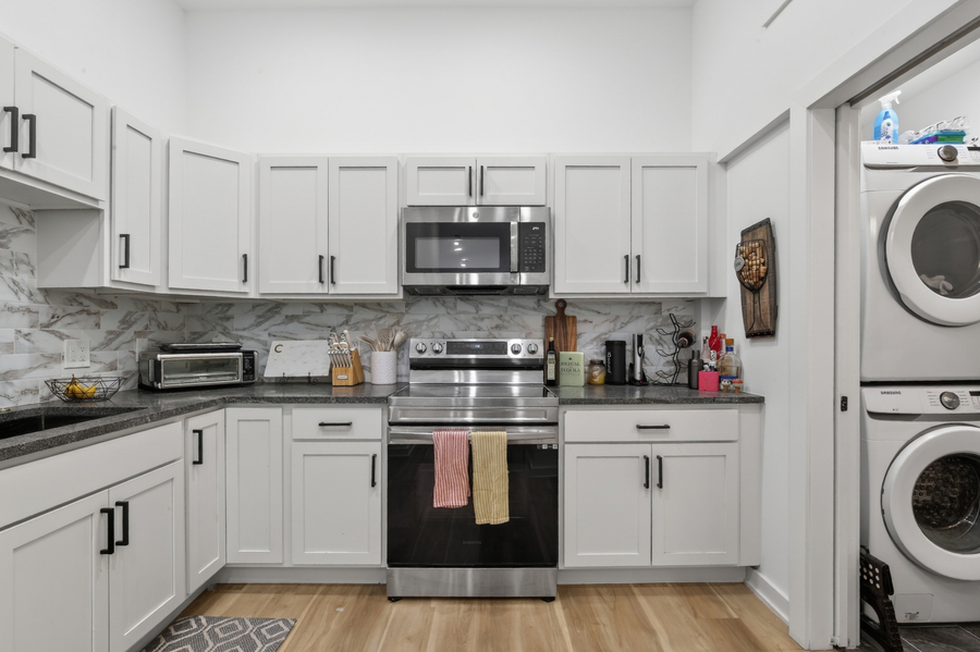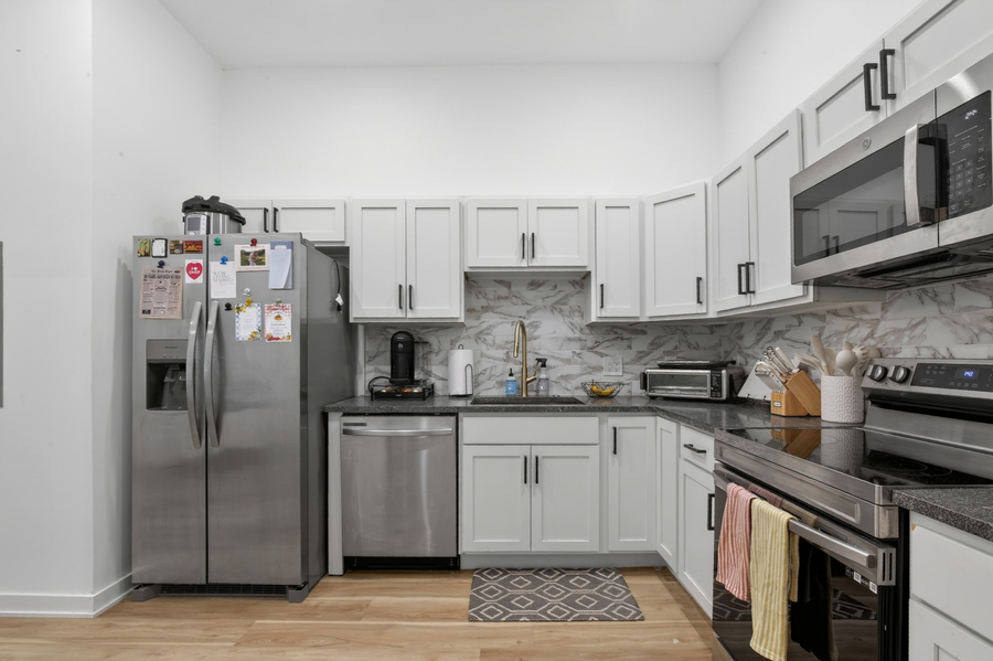 Available Early July: Unit #202 is a 1 bedroom, 1 bathroom second-floor rental apartment features high ceilings, wood floors, and recessed lighting. Please note: photos are from a similar unit within the building; exact layouts & finishes may vary.