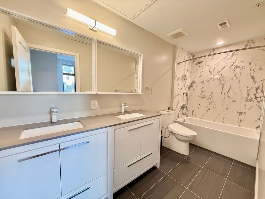 Ensuite primary bathroom with daul vanity, Porcelanosa tile and bidet