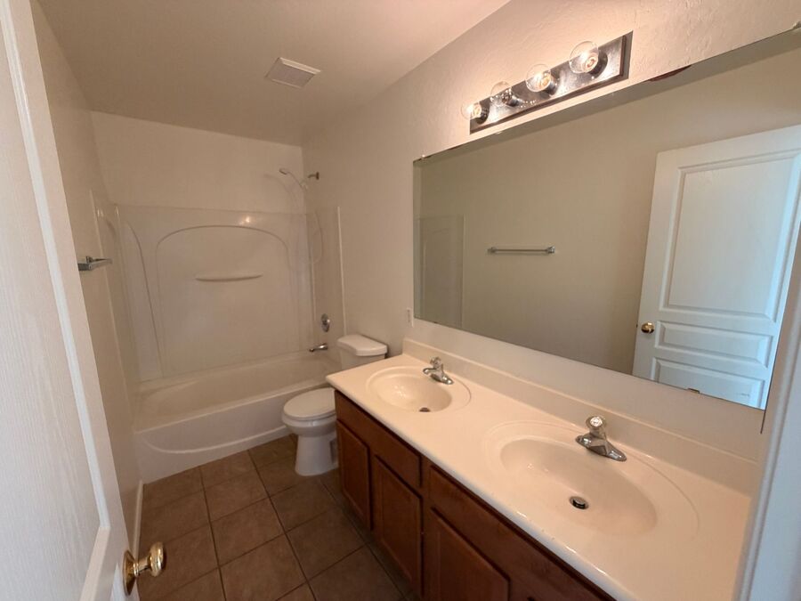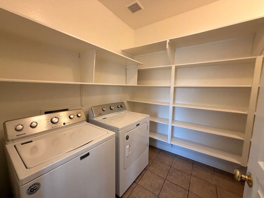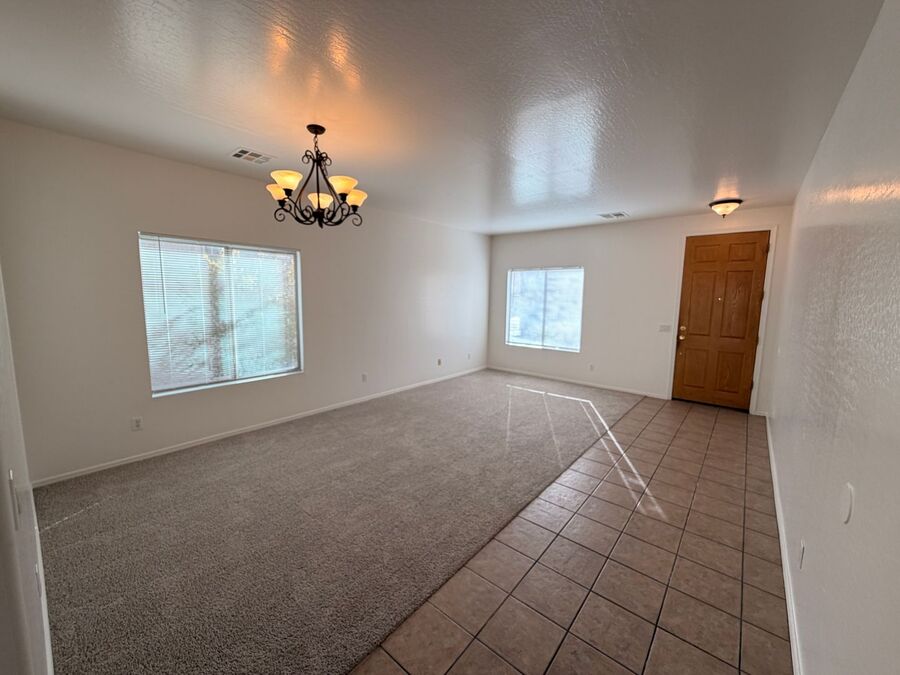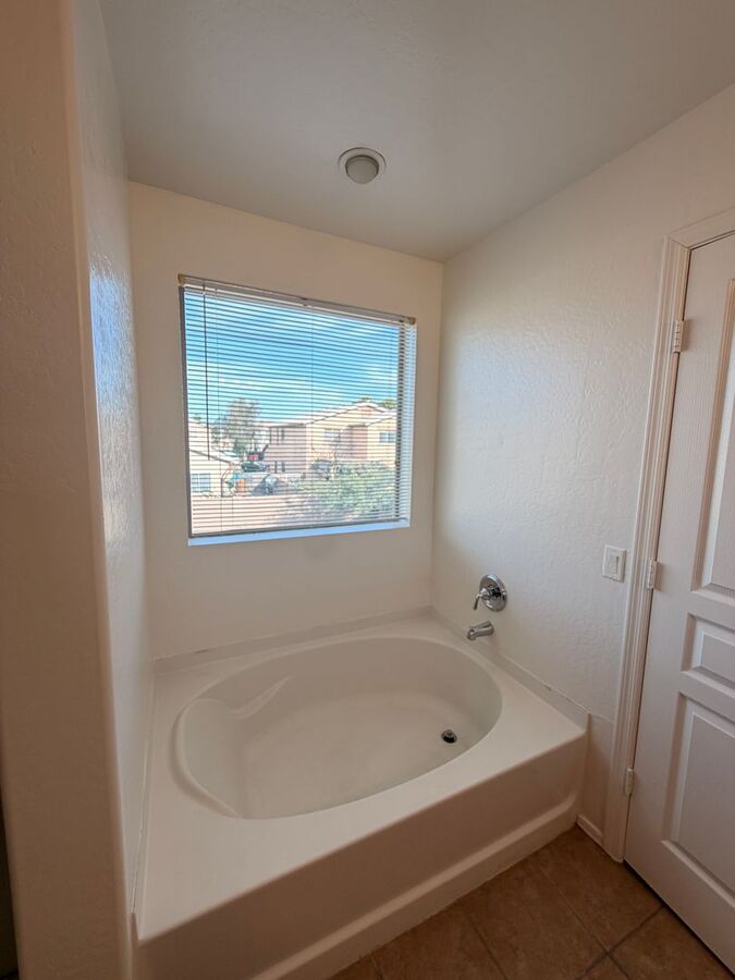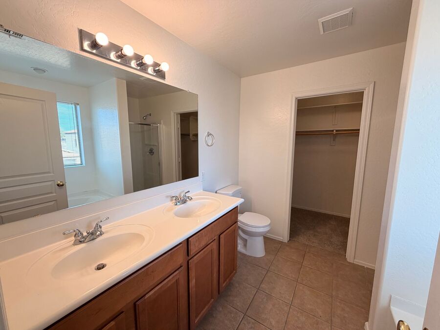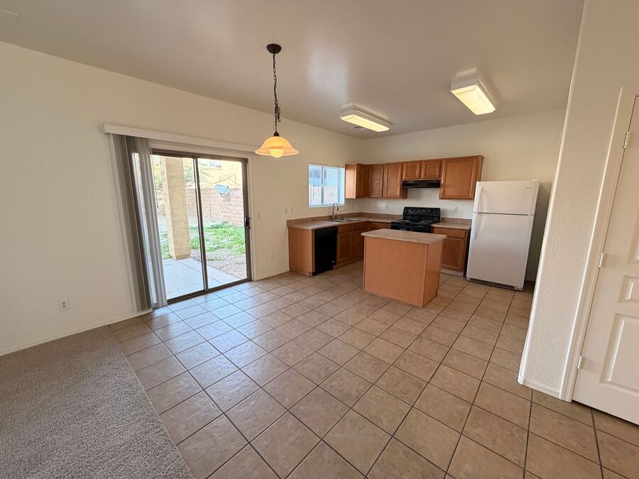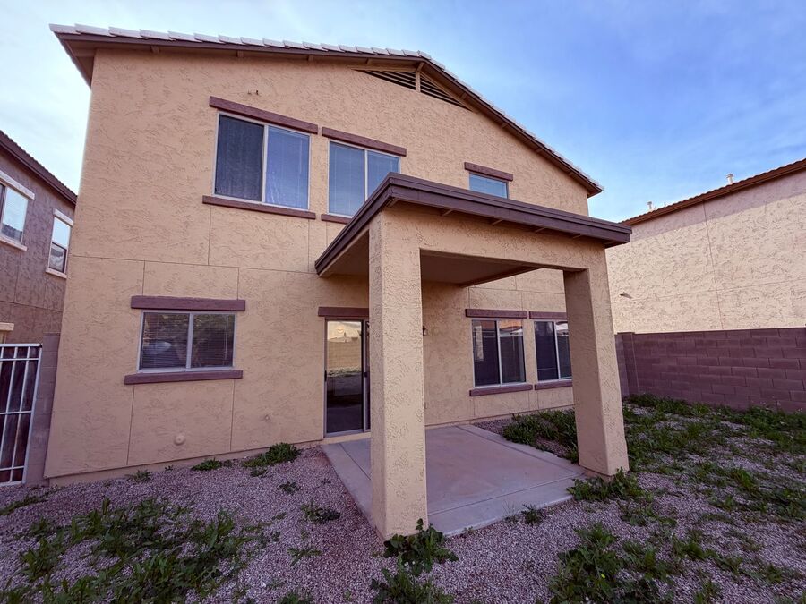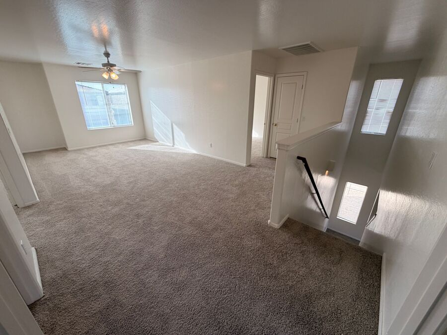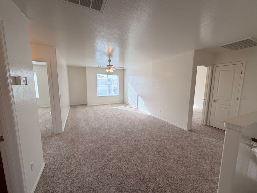 This expansive two-story residence offers three bedrooms and two and a half bathrooms with a thoughtfully designed floor plan that balances functionality and flexibility. Upon entry, you are welcomed by a spacious great room complemented by a separate family room, creating multiple living and entertaining areas. The eat-in kitchen features a center island, plenty cabinet space, and an oversized walk-in pantry with washer and dryer. A half bathroom is also located on the first floor for guests. Upstairs, a versatile loft provides the perfect space for a home office, media room, or play area. The primary suite is generously sized and includes a large walk-in closet and a private bathroom with dual sinks and a separate soaking tub and shower. Secondary bedrooms are well proportioned and share a full bathroom with double sinks. Additional interior features include ceiling fans, window coverings throughout, a mix of carpet and tile flooring. The exterior offers a two-car garage, covered patio for outdoor relaxation, and low-maintenance desert landscaping in both the front and backyard. Home is friendly to a max of two spayed/neutered pets with $350.00 per pet deposit.