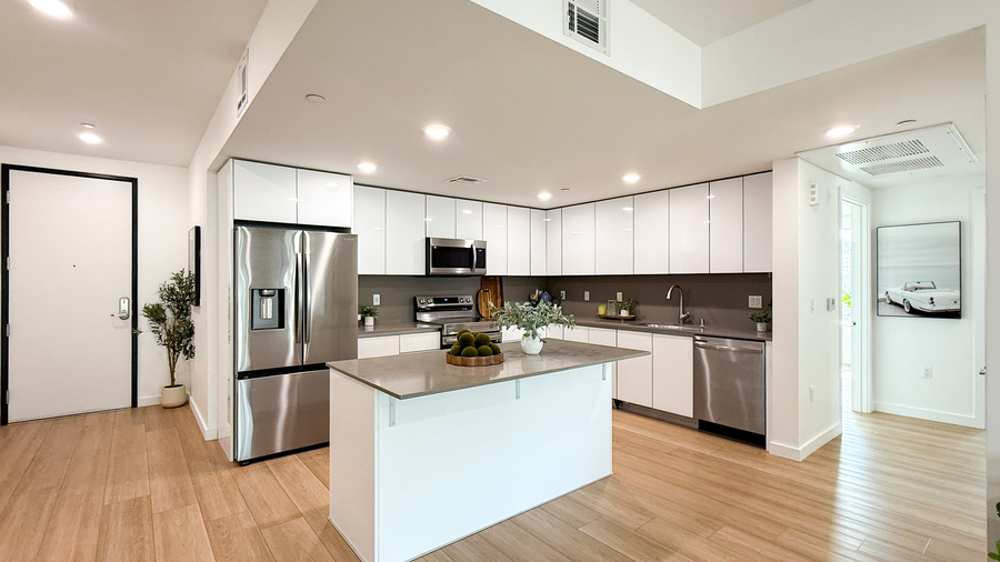 Inside, the lines are clean, the finishes sharp. Spacious open floor plans flow into sleek, high-gloss kitchens outfitted with stainless steel appliances, smooth quartz counters, and minimalist cabinetry. Some units include center islands — just the place to pour a nightcap or hash out a third-act twist. Floor-to-ceiling sliders open wide onto massive private decks, perfect for morning espresso or twilight scripts. And if you’re lucky? Your view includes Capitol Records, the Hollywood Sign, and the glittering skyline of your next chapter.