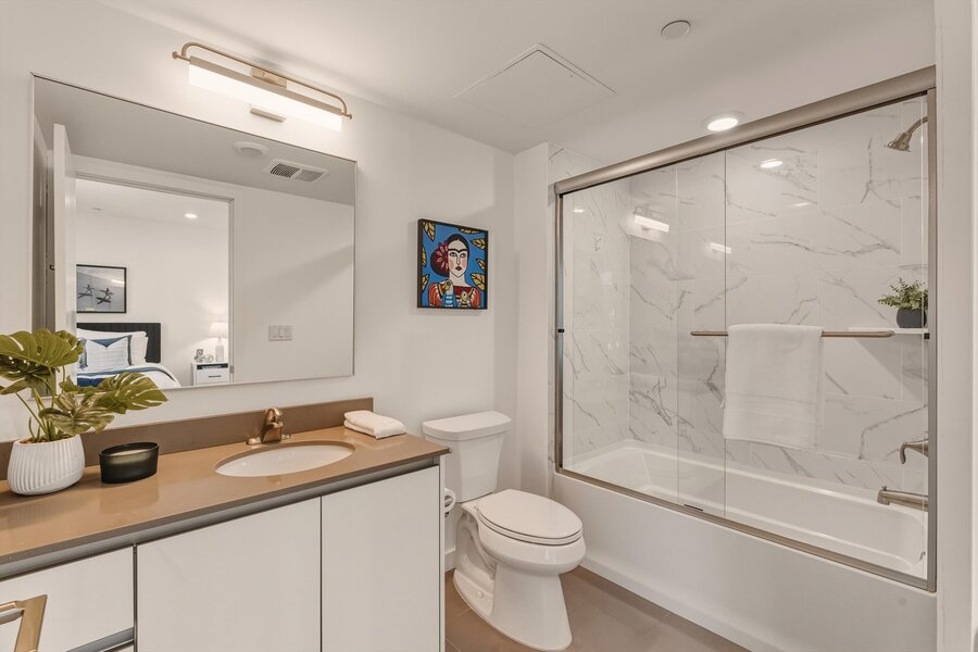 Each unit offers bright bedrooms, generous closets, and bathrooms with modern vanities and marble-style tile that whispers luxury without shouting it. Throughout, pale wide-plank floors keep things grounded while natural light steals the scene.