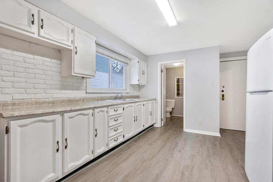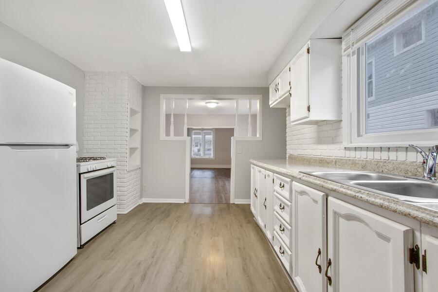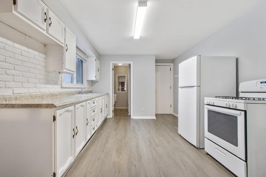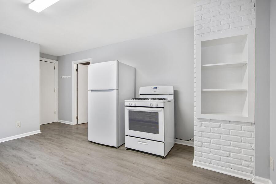 The kitchen provides extensive cabinet storage and ample counter space and comes equipped with both a refrigerator and stove. The separate dining room flows smoothly into a spacious living room, creating a functional and welcoming main living area.