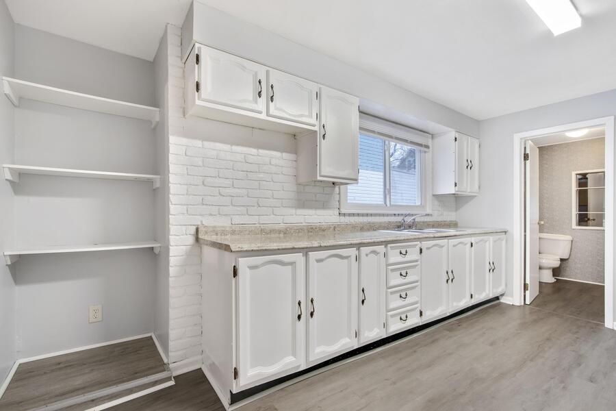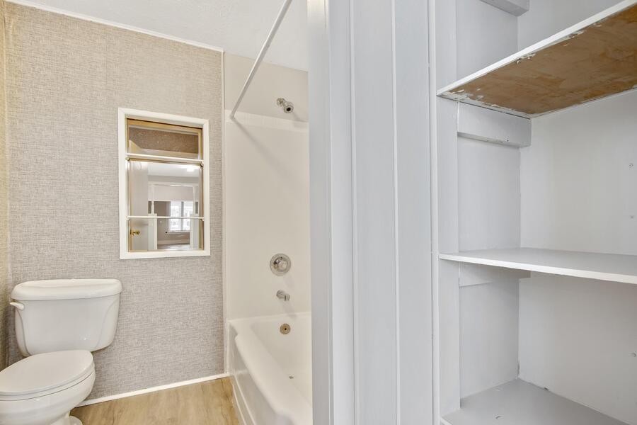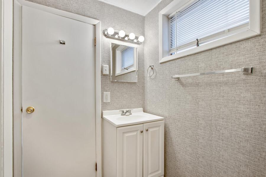 The bathroom has an updated vanity with beautiful vanity lighting. There is also built in shelving giving this smaller bathroom plenty of storage space!