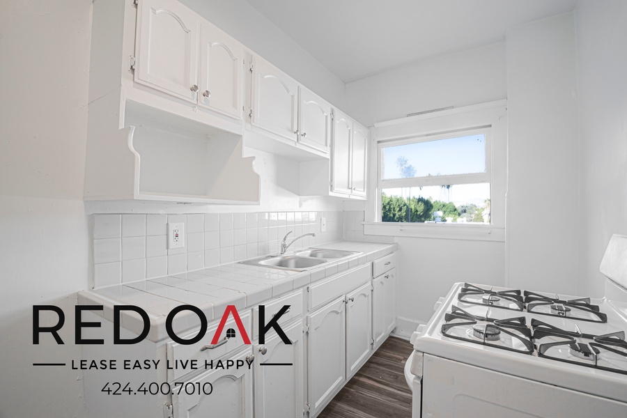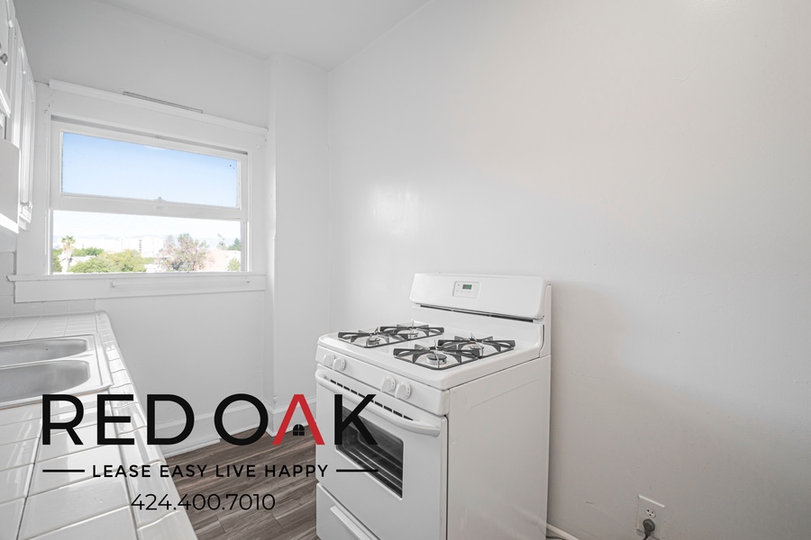 ~ Kitchen: Custom cabinets, tile countertops & gas stove/oven.