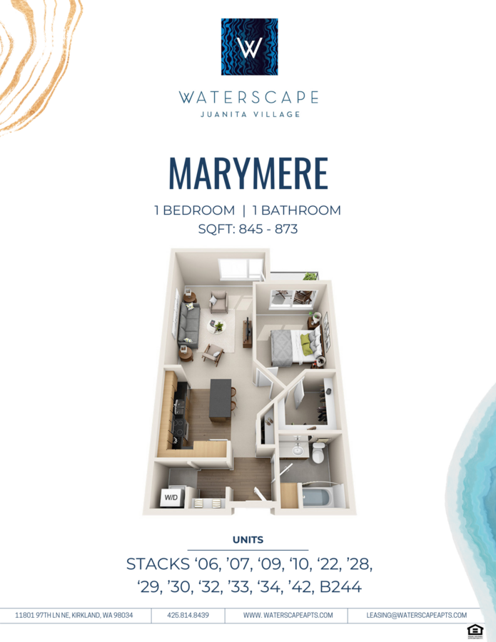 Welcome to Waterscape at Juanita Village, a vibrant lakeside community nestled in the heart of Kirkland. These thoughtfully designed apartment homes offer the perfect blend of comfort, convenience, and urban charm, with stunning views of Lake Washington. Each residence features spacious layouts, upscale finishes, and private patios or balconies- ideal for enjoying the serene surroundings. With waterfront trails, local cafés, boutique shopping, and entertainment options just blocks away, Waterscape delivers a modern living experience in one of the area’s most sought-after neighborhoods.