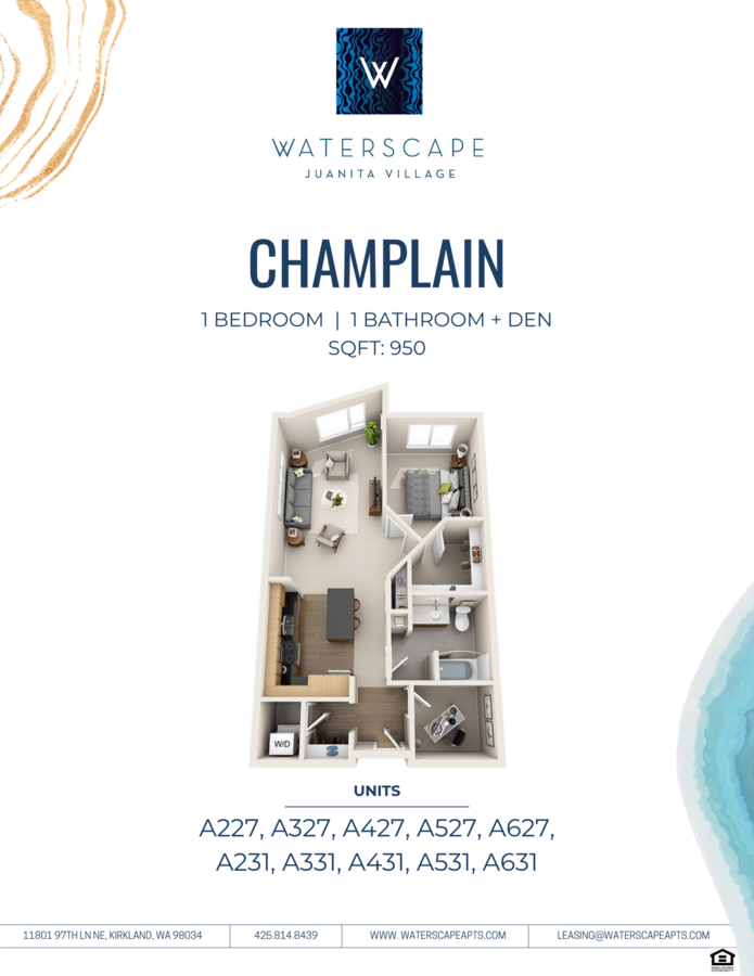 Welcome to Waterscape at Juanita Village, a vibrant lakeside community nestled in the heart of Kirkland. These thoughtfully designed apartment homes offer the perfect blend of comfort, convenience, and urban charm, with stunning views of Lake Washington. Each residence features spacious layouts, upscale finishes, and private patios or balconies- ideal for enjoying the serene surroundings. With waterfront trails, local cafés, boutique shopping, and entertainment options just blocks away, Waterscape delivers a modern living experience in one of the area’s most sought-after neighborhoods.