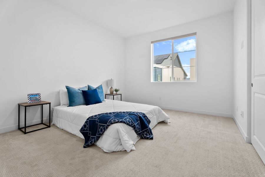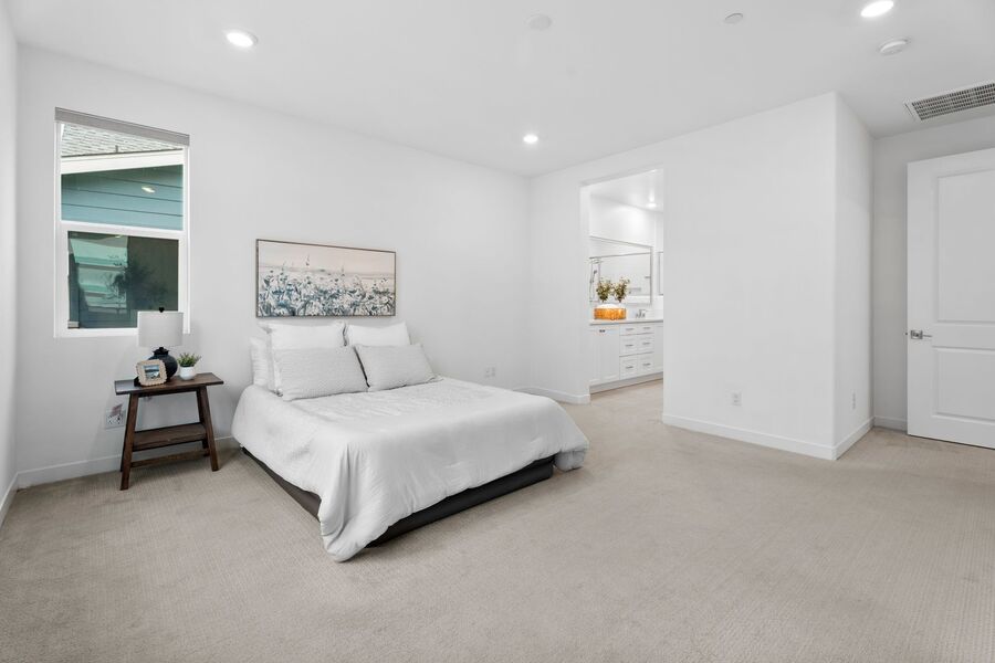 Stunning three-bedroom home, plus a loft, and solar, situated in the lovely Five Point community. As you step inside, you are greeted by a spacious living room, dining area, and kitchen that boasts luxury vinyl plank flooring. The dining area has an oversized sliding glass door that leads to a side yard with low-maintenance artificial turf. The kitchen is beautiful and features a large island with ample seating space, recessed lighting, and stainless steel appliances, including a gas stovetop, single oven, microwave, dishwasher, and refrigerator. There is a half bathroom downstairs. Upstairs, you'll find a spacious loft with a balcony, perfect for relaxing and enjoying the beautiful community. The primary bedroom features carpeting, recessed lighting, and an ensuite bathroom with dual sinks, tile flooring, a large walk-in shower, and a walk-in closet. Two guest rooms feature carpet flooring and a full guest bathroom with dual sinks. The laundry room is located upstairs and has built-in cabinets and hookups for a washer and dryer. Additionally, there is an attached two-car garage with an EV charger and a spacious storage closet. The Five Point community has fantastic amenities, including a clubhouse, park, swimming pool, spa, and wading pool. It is conveniently located close to the freeway, shopping, and is only a short distance from Magic Mountain. *Owner may consider a small pet.