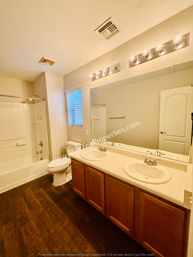 Upstairs, all bedrooms are located alongside a guest bathroom. The primary bedroom features an en-suite bathroom with a double-sink vanity, separate shower area, and a generously sized walk-in closet.
