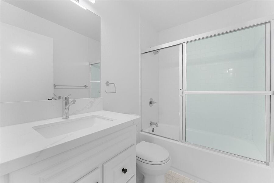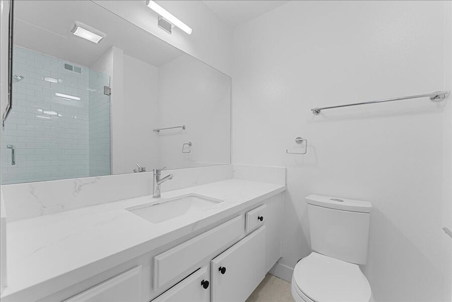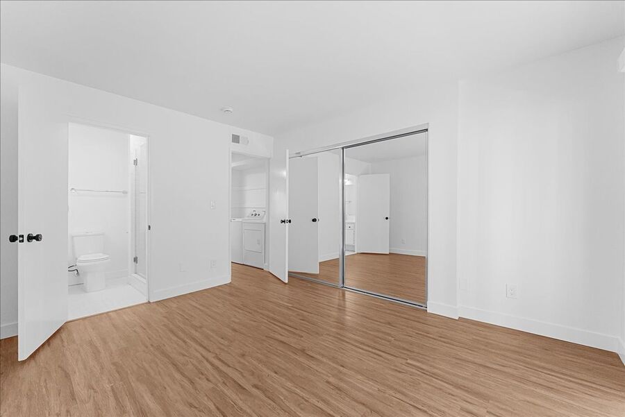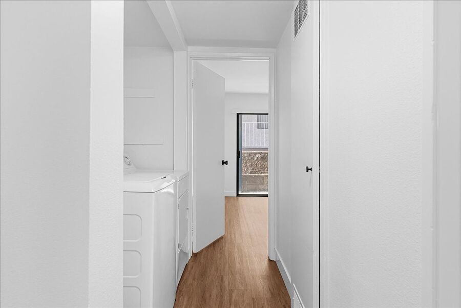 Beyond the kitchen, you'll find an expansive living and dining area—perfect for unwinding after work or hosting intimate gatherings with friends and family. Enjoy a morning coffee on the expansive private patio that stretches the entire width of the apartment which connects to the living room and primary bedroom. Down the hall, you'll discover in-unit laundry for your convenience, as well as the main hallway bathroom. The two bedrooms are separated for added privacy, with the master featuring an en-suite bathroom and built-in closets with mirrored sliding doors.