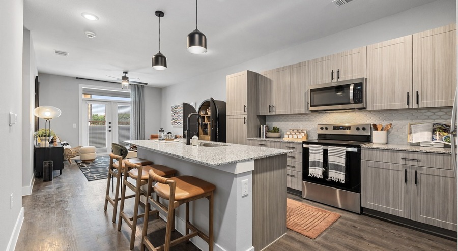 Experience elevated living that combines contemporary sophistication with laid‑back ease. These stylish apartments offer open-concept layouts featuring designer finishes—including stainless steel appliances, quartz countertops, sleek cabinetry, and wood-style flooring. Floor-to-ceiling windows invite abundant natural light, while in-unit washers and dryers, smart home technology, and spacious walk-in closets ensure everyday convenience. Community amenities are tailored for both wellness and connection: unwind by the resort-style pool, stay energized in the fully equipped fitness center, and gather with neighbors in outdoor courtyards complete with grilling stations and lounge seating. A resident lounge and dedicated co‑working spaces support both social engagement and productivity. Pet owners enjoy a dog park and pet spa, making it easy to include furry family members in the lifestyle. Additional perks like controlled-access entry, valet trash service, and on-site management simplify daily routines. Thoughtfully designed for residents who seek both tranquility and community, this neighborhood delivers comfort, elegance, and meaningful experiences in perfect balance.