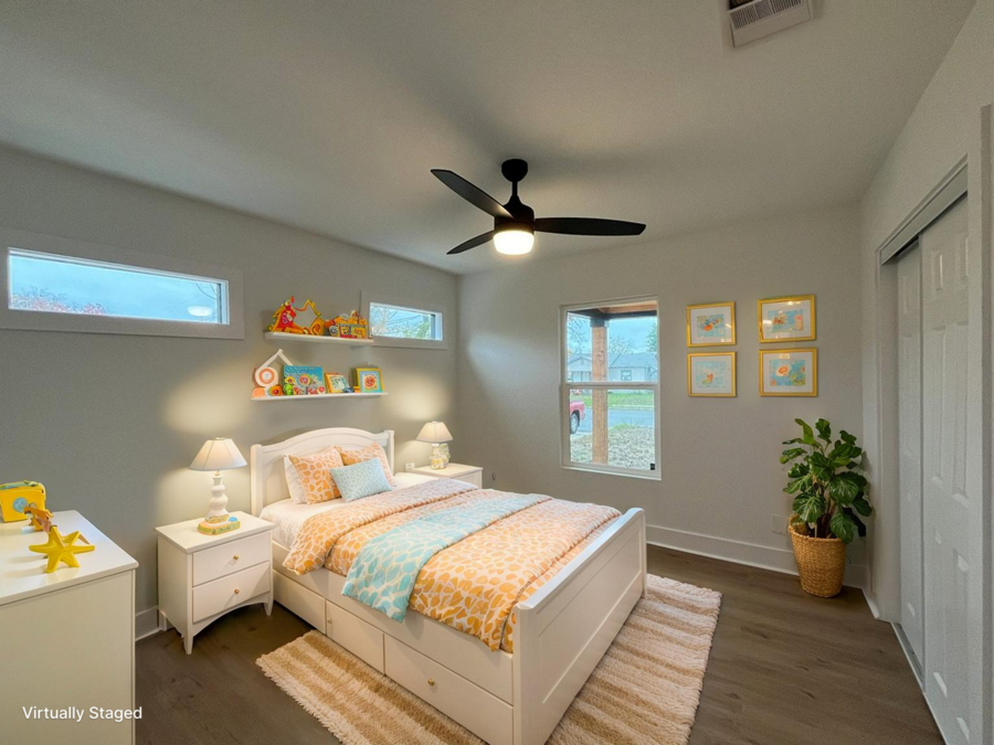 The primary bedroom offers private ensuite with a double vanity and walk-in shower, creating a relaxing retreat. A convenient laundry closet includes stacked washer/dryer connections. Step outside to enjoy the backyard with a chain-link fence, gutters, mature trees, and a patio, ideal for outdoor relaxation. Located close to shopping and everyday conveniences, this home blends comfort, practicality, and a welcoming atmosphere in a great community setting.