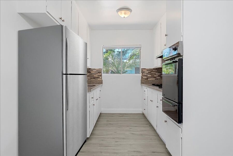 The alley style kitchen is a highlight: abundant countertop space, ample cabinetry for storage, and stainless steel appliances that give both form and function. The bedroom offers a spacious floor plan with built-in closets and mirrored sliding doors. The bathroom in conveniently located next to the bedroom for ease along with additional hallway storage.
