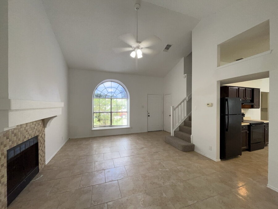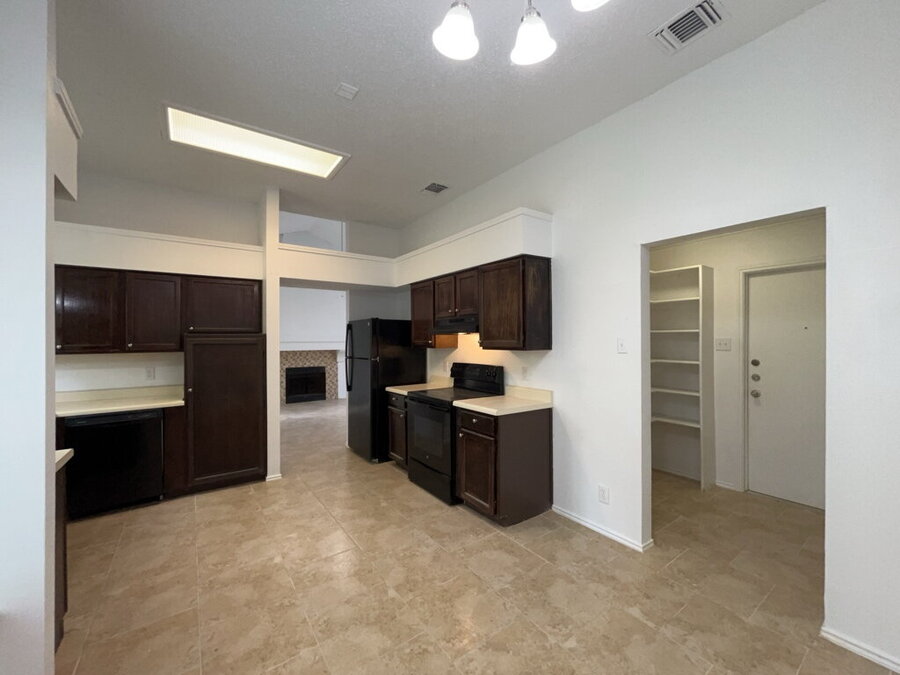 The living room is bright and welcoming, highlighted by a cozy fireplace and impressive floor-to-ceiling windows that fill the space with natural light. For added comfort and efficiency, the home includes HVAC with a programmable thermostat as well as a carbon monoxide detector. The kitchen offers a practical and welcoming space for cooking and gathering, complete with an electric glass cooktop stove, dishwasher, refrigerator, pantry, and a convenient eat-in dining area.