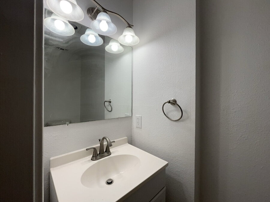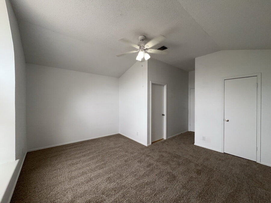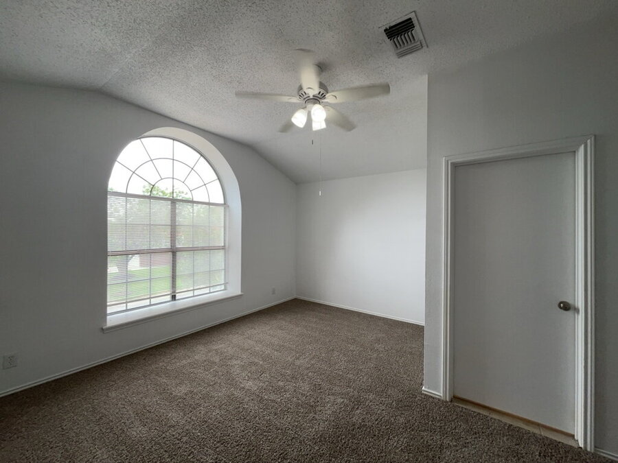 Upstairs, the primary bedroom features high ceilings that create an open, airy feel. The ensuite bathroom includes a garden tub/shower combo, single vanity, and a spacious walk-in closet.