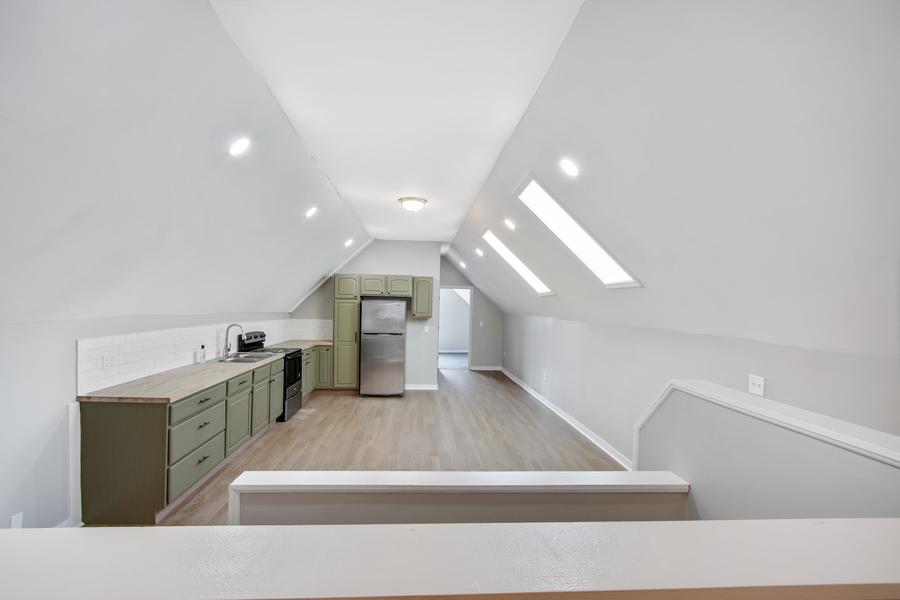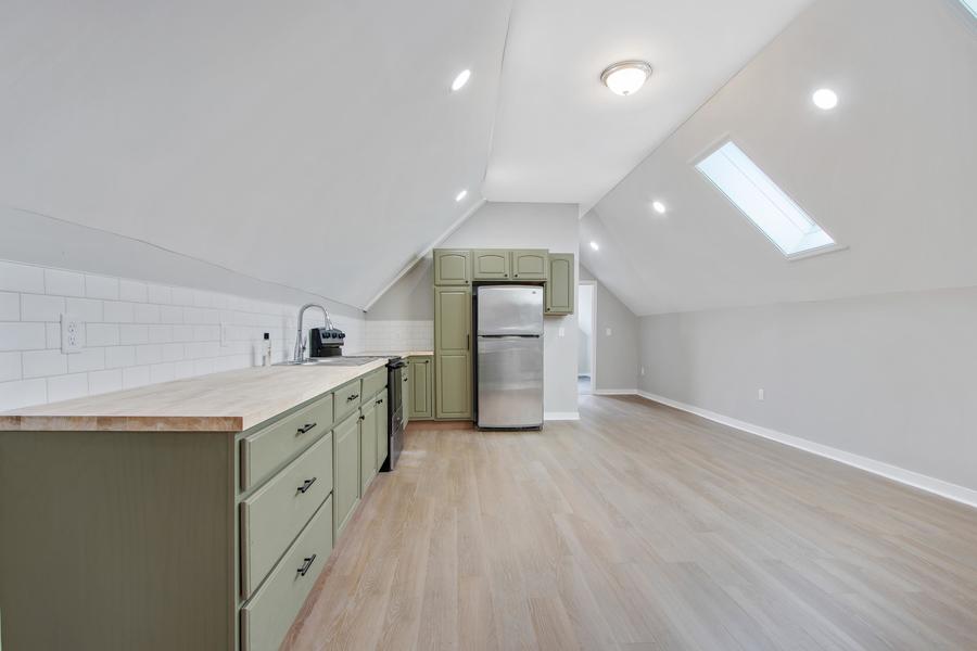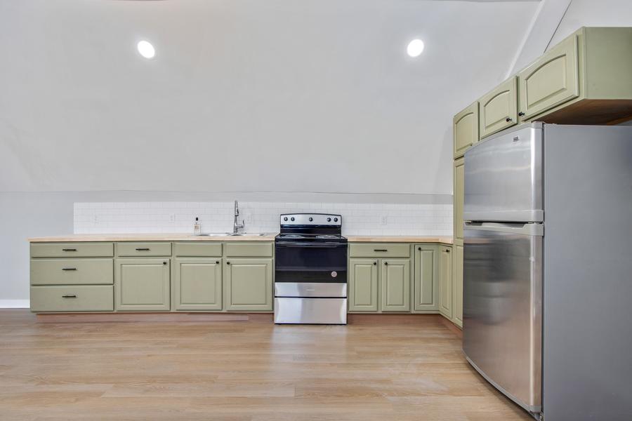 The kitchen is thoughtfully designed with gorgeous cabinetry, beautiful butcher block-style countertops, ample counter and cabinet space. It also comes equipped with stainless steel appliances including a refrigerator and stove, making it both stylish and functional.