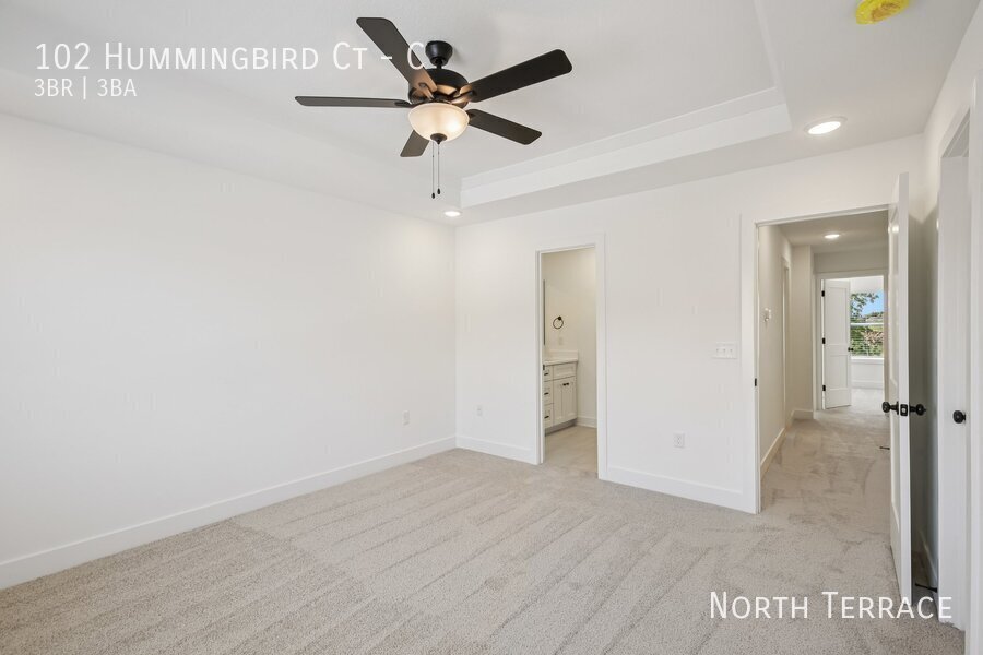 1st bedroom is 13'x17', fits a king bed, has a walk-in closet, has a master bath