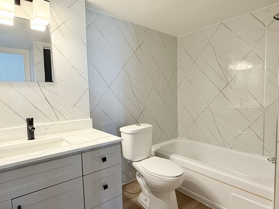 Modern bathroom with new vanity, mirror, and tub/shower combo