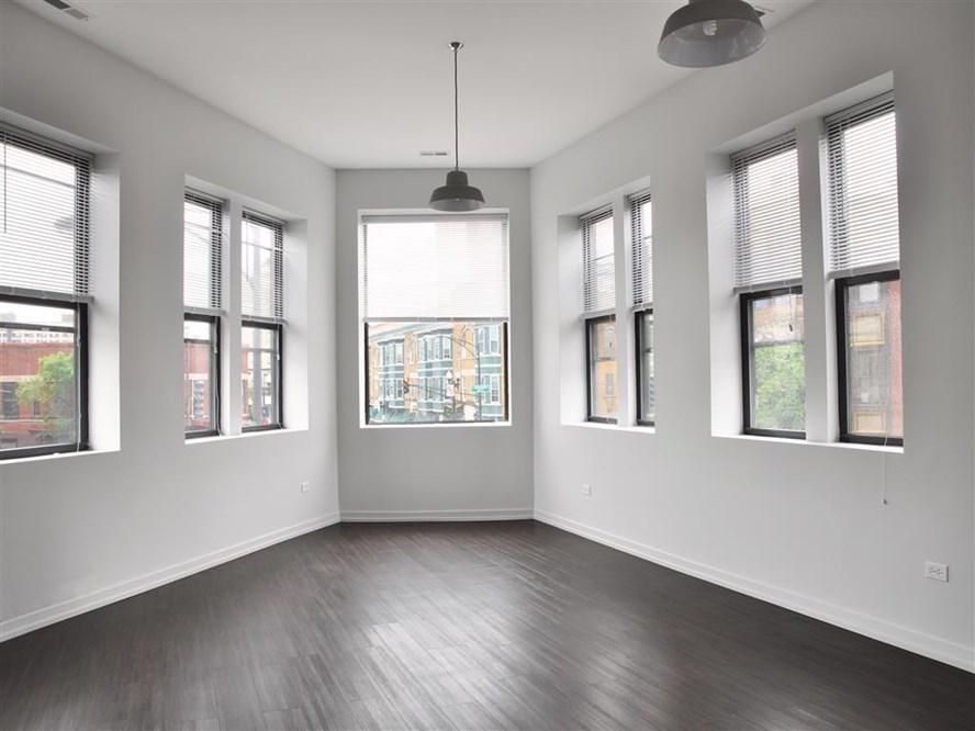 The modern-finished apartments feature hardwood flooring, custom kitchen cabinets and shelving, granite counter tops, modern appliances, in-unit washer and dryer, and loads of natural light from the rows of large windows.