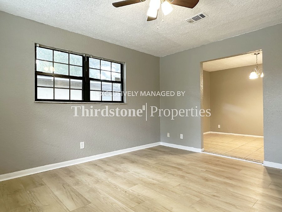 This charming 3 bedroom, 1.5 bath home offers both comfort and convenience in a well-designed layout. A two-car off-street parking area leads to a welcoming front patio, providing additional space for outdoor seating or décor to greet guests in style. Inside, durable vinyl plank flooring spans the main living areas, while cool tile flooring in the kitchen makes cleanup a breeze. The kitchen features abundant storage within the beautifully stained cabinetry, complemented by updated countertops that add a modern touch. Elegant light fixtures and updated ceiling fans are thoughtfully placed throughout the home, enhancing both comfort and style. Large windows fill the home with natural sunlight, creating a warm and inviting atmosphere in every room. The full bathroom boasts a spacious bathtub/shower combination surrounded by striking stone tile walls. A generous fenced backyard provides ample room for outdoor activities or entertaining. Washer/Dryer hook-ups are available for added convenience. The residents are responsible for all utilities and lawn care. Dogs are welcome, breed and weight restrictions may apply. Application fee $55 per person 18 and over. Lease Term: 12 months.