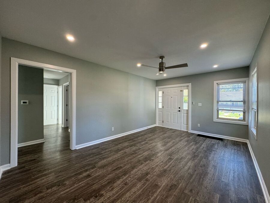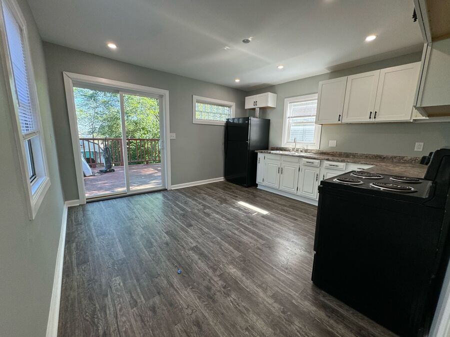 Step inside to discover a bright, open layout with sleek, contemporary finishes throughout. The spacious kitchen features updated cabinetry, stainless steel appliances, and modern lighting — perfect for cooking or entertaining with ease. The two full bathrooms have been tastefully remodeled, offering a fresh, polished feel from top to bottom. Ceiling fans in living rooms