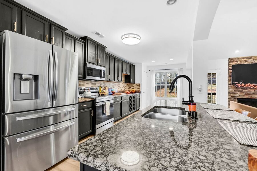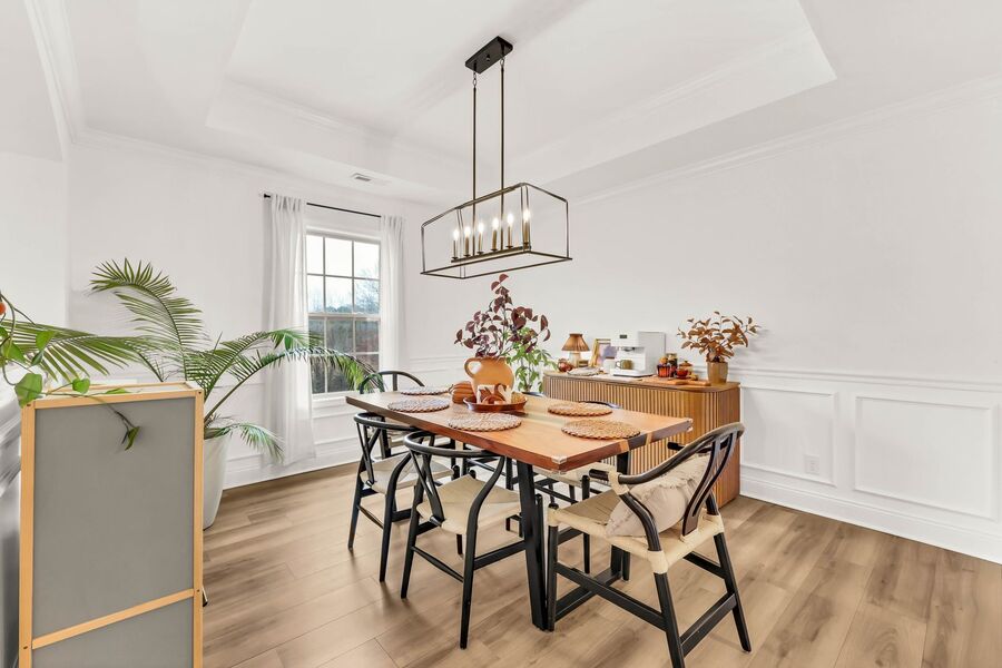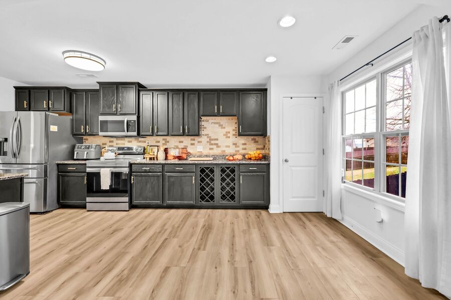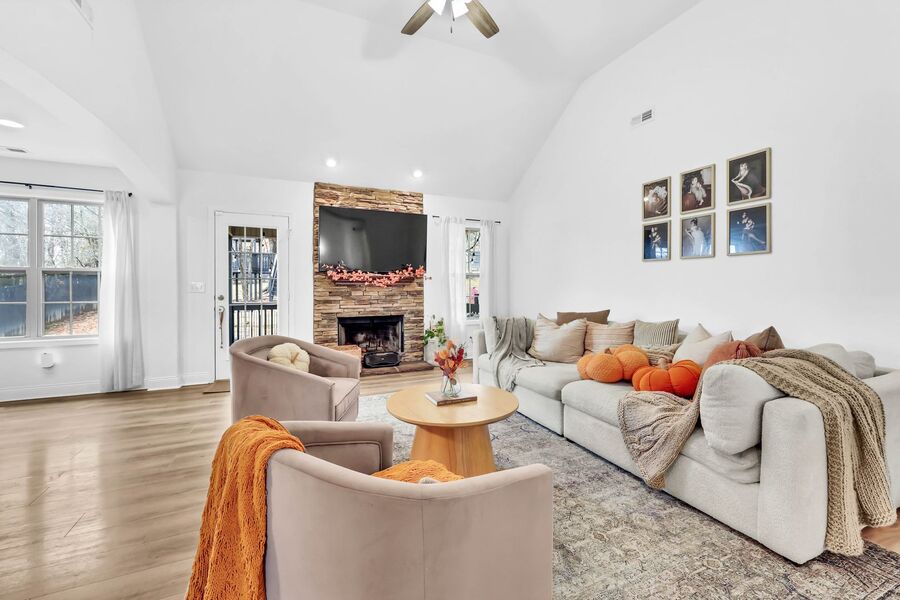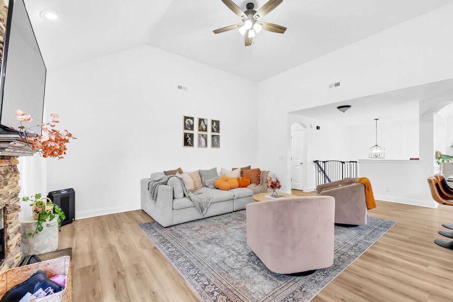 This 4-bedroom, 3-bath home features open living and dining areas with hardwood floors and vaulted ceilings. The kitchen includes granite countertops and an eat-in space, while the primary suite offers dual vanities and a soaking tub. Home is equipped with brand new carpet. A covered deck overlooks the fenced backyard, and a two-car garage adds convenience. The perfect blend of suburban comfort with city-area convenience.