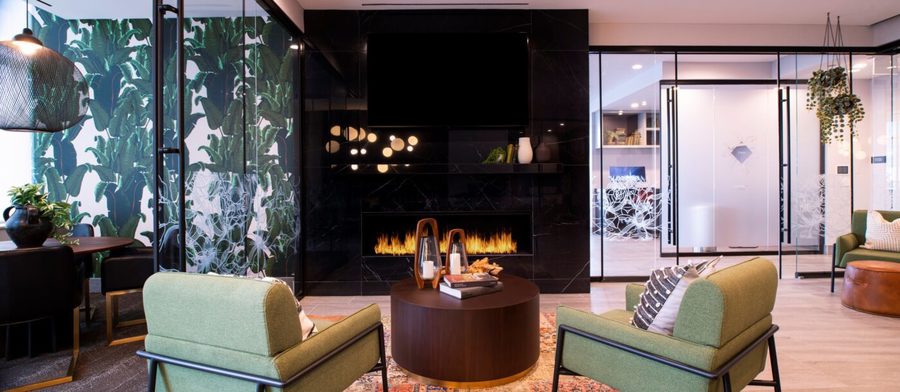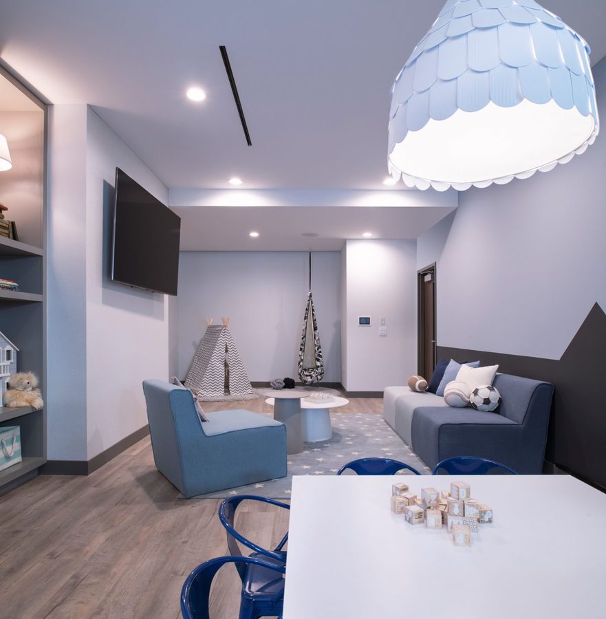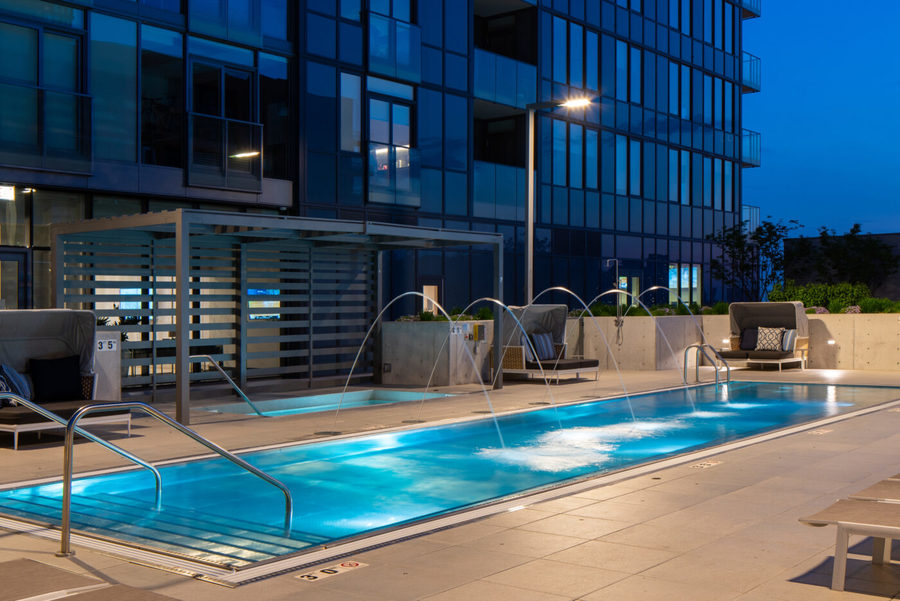 Resort-quality amenities were designed to impress and provide plenty of recreation and relaxation options for residents. They include a hot tub, sauna, heated pool, huge green space terrace, fitness center, indoor basketball court, bowling alley, outdoor bocce ball court, and several gorgeous lounge areas.