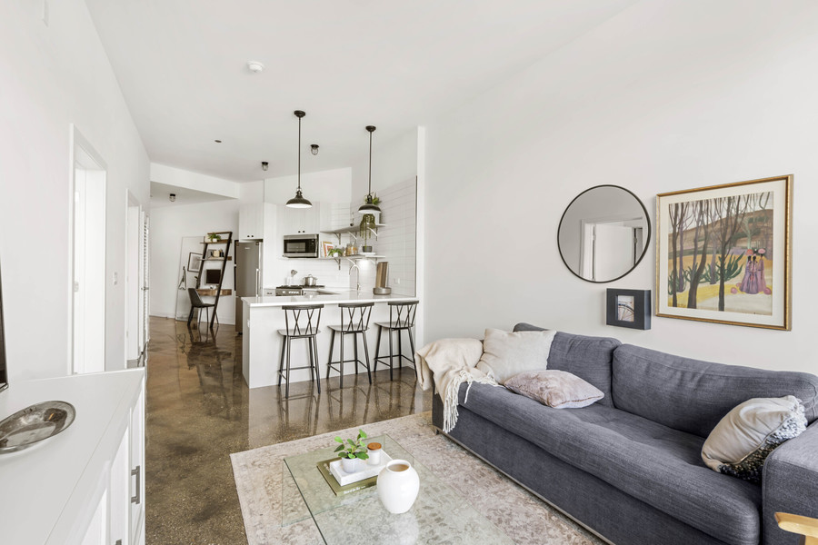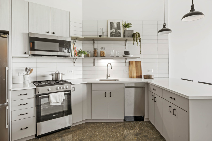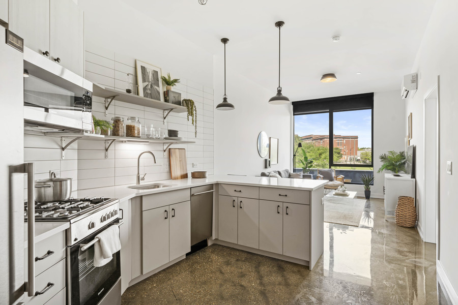 These apartments are high on stylish details with industrial-chic light fixtures, polished concrete floors and sky-high ceilings. Each unit includes stainless steel appliances, a gas range stove, an in-unit washer and dryer, a bold tile backsplash, and sleek bathroom with glass-enclosed rain shower. Select apartments also feature balconies, walk-in closets and kitchen islands.