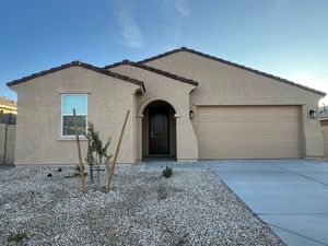 Well-kept 3-bed / 2-bath Goodyear home is move-in ready! Kitchen has lots of honey oak cabinetry, granite counters, island with optional bar seating, pantry, and separate formal dining area. Primary bedroom boasts a walk-in closet with drawers and built-in shelving, and ensuite bathroom offering dual sinks, and separate garden tub and shower. Attached garage and large backyard with covered patio and pavers. Schedule a tour!