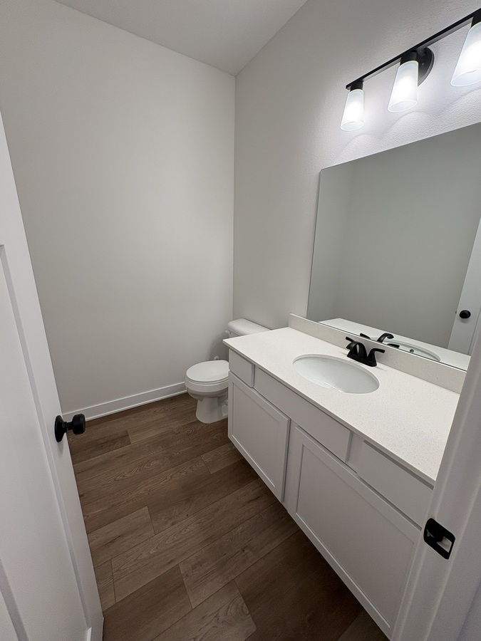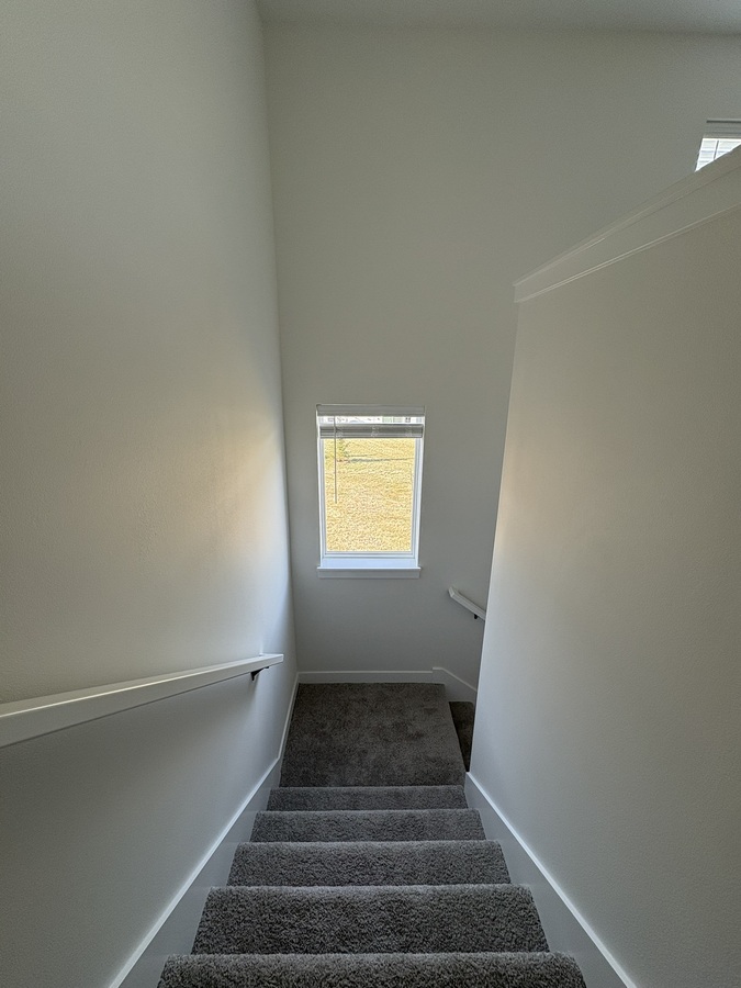 The main level features an open and airy floor plan with 9-foot ceilings, luxury vinyl plank flooring, and large windows that bring in plenty of natural light. The kitchen is thoughtfully designed with a large pantry, center island, granite countertops, and stainless steel appliances, all included. A convenient half bathroom completes the main floor.