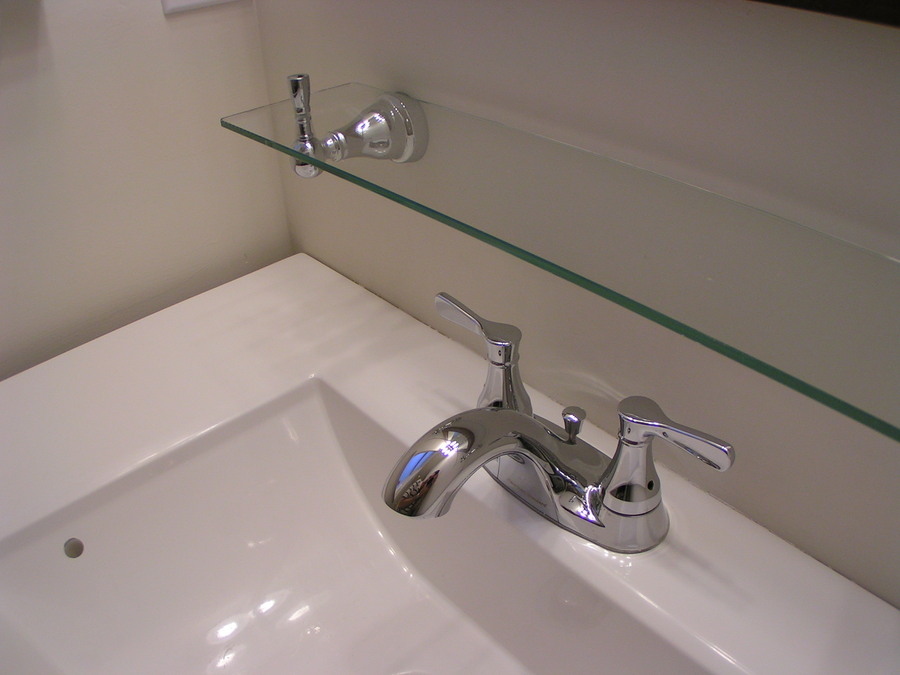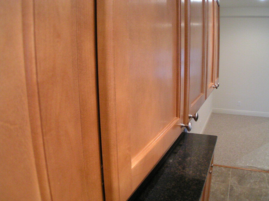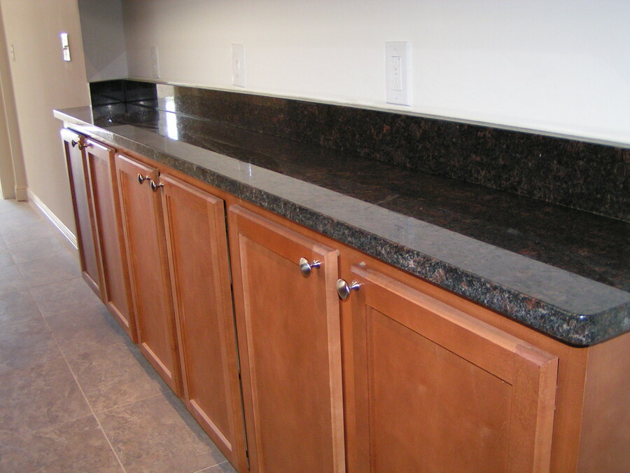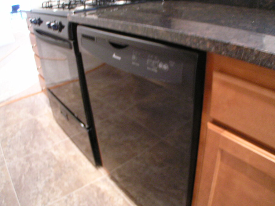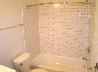 The sleek, contemporary kitchen is both stylish and practical, featuring granite countertops, warm red/caramel-toned cabinetry, black appliances, and a porcelain tile floor. The spa-like bathroom offers a dark wood vanity, marble flooring, and a clean, classic subway-tile tub surround.