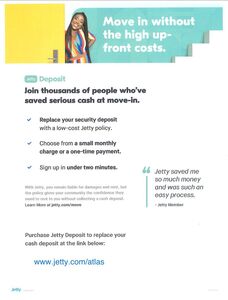 Deposit: Atlas Real Estate has partnered with Jetty to offer an affordable alternative to upfront cash security deposits. Approved residents can choose between paying a security deposit equal to one (1) month’s rent (on approved application) OR purchase a security bond policy with Jetty at a fraction of the upfront cost. Jetty programs do require a security bond equal to two (2) months rent.