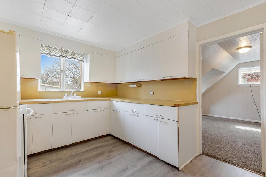 The kitchen is well appointed with an abundance of crisp white cabinetry, providing excellent storage and ample counter space for meal preparation. It comes fully equipped with essential appliances, including a refrigerator and stove, making it move-in ready.